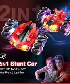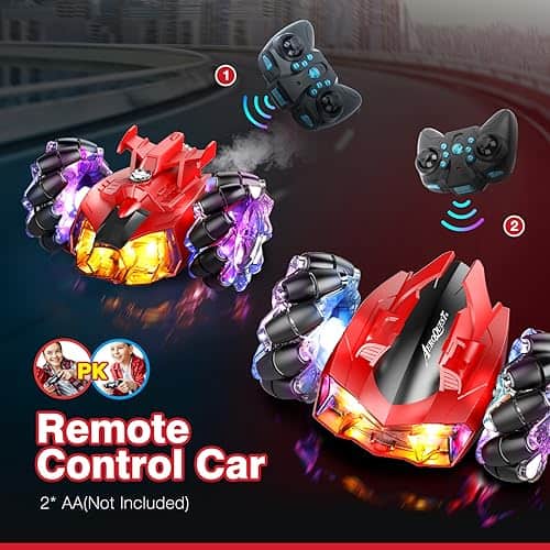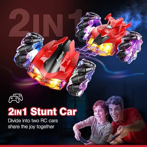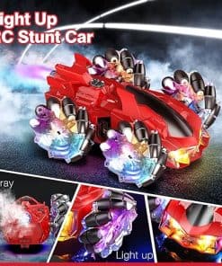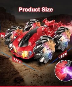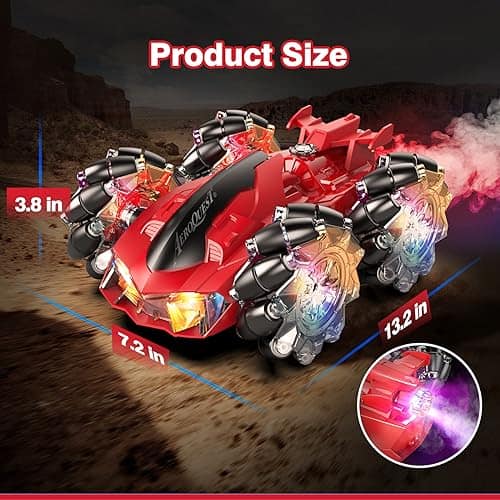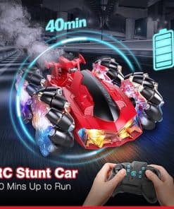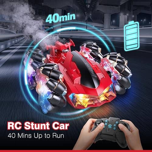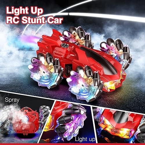 2. Coche RC de Acrobacias con Luces: Los 7 LED en el cuerpo del coche RC permiten que el coche de acrobacias te brinde diversión competitiva incluso de noche. La combinación de colores clásicos rojo y negro hace que el coche de control remoto sea muy impactante visualmente. La parte trasera del coche puede rociar con luces.