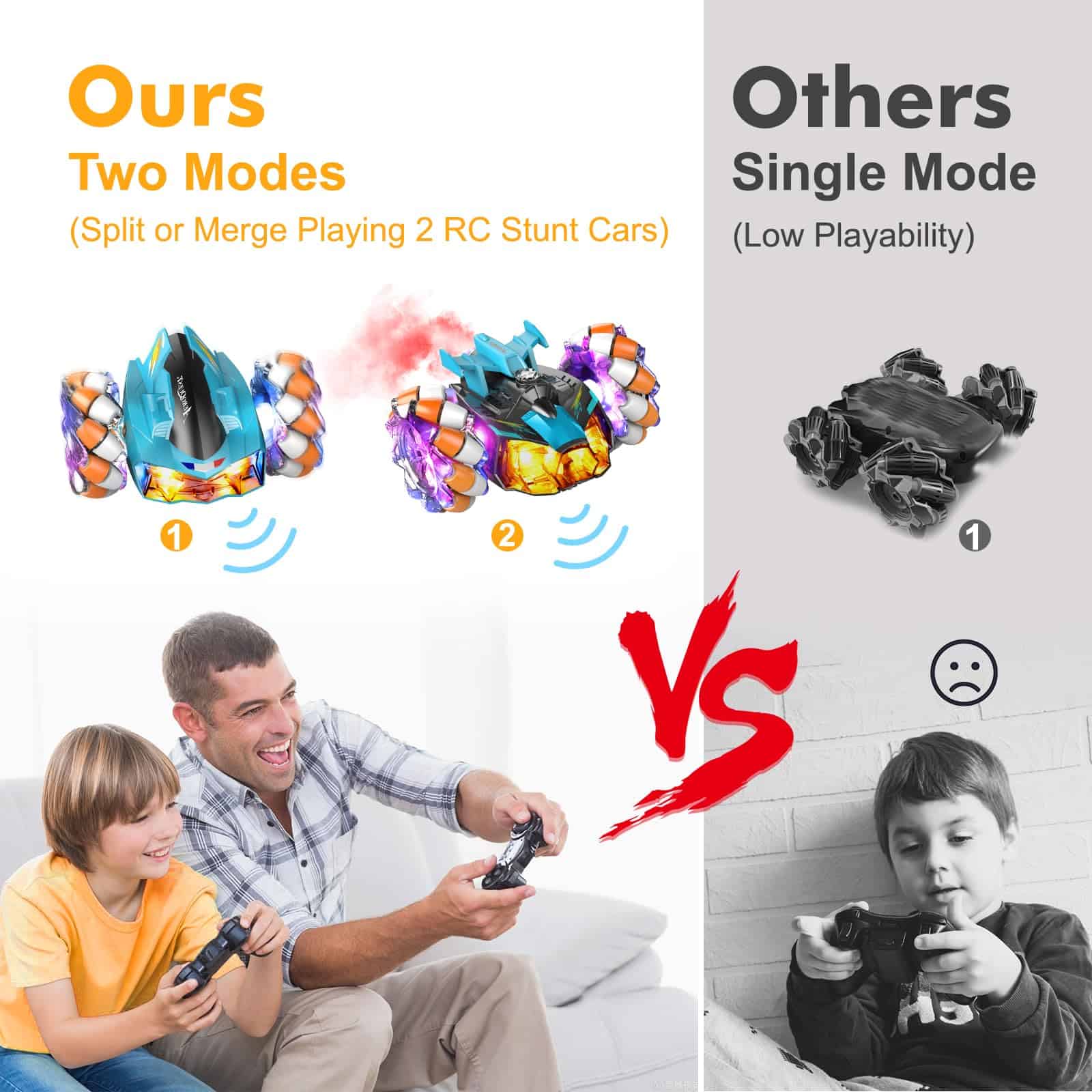 1. Doble emoción: Este coche de acrobacias control remoto se divide en dos, cada uno controlado por su propio control remoto de 2.4GHz. Con luces deslumbrantes y efectos de escape, es perfecto para batallas de carreras de niños y diversión familiar. Doble los coches, doble la emoción.