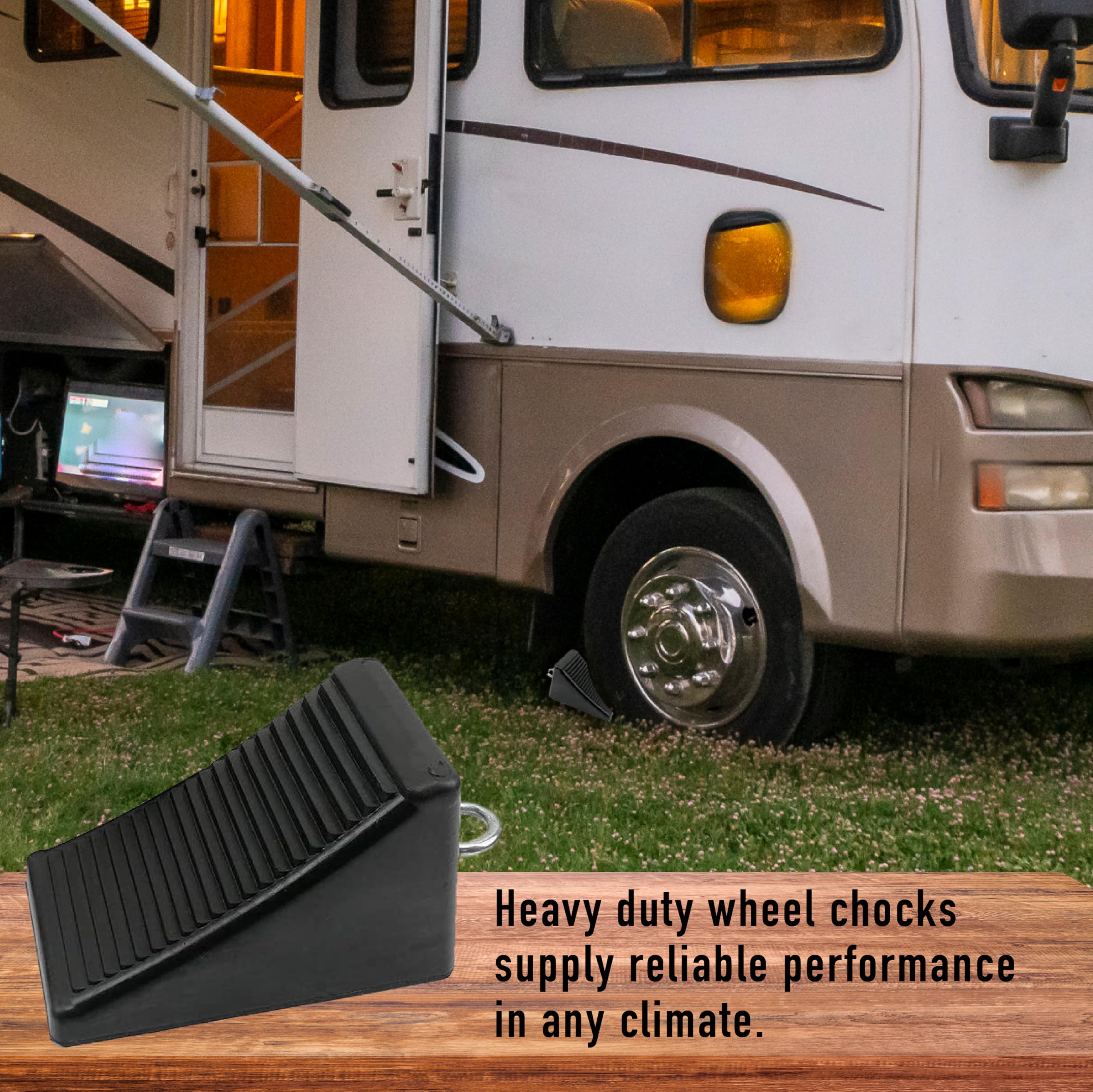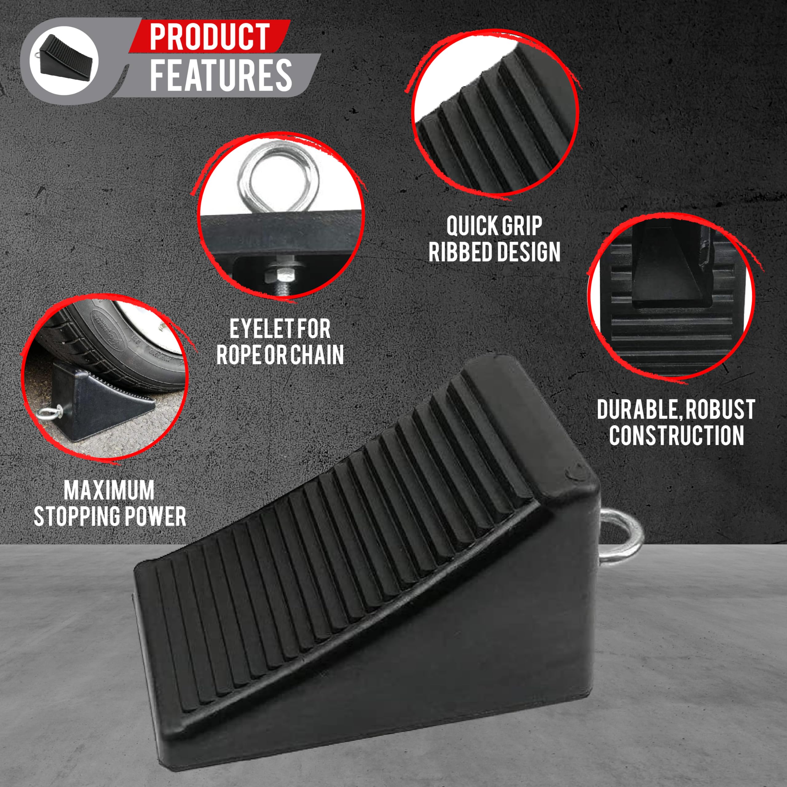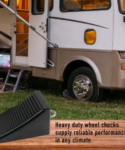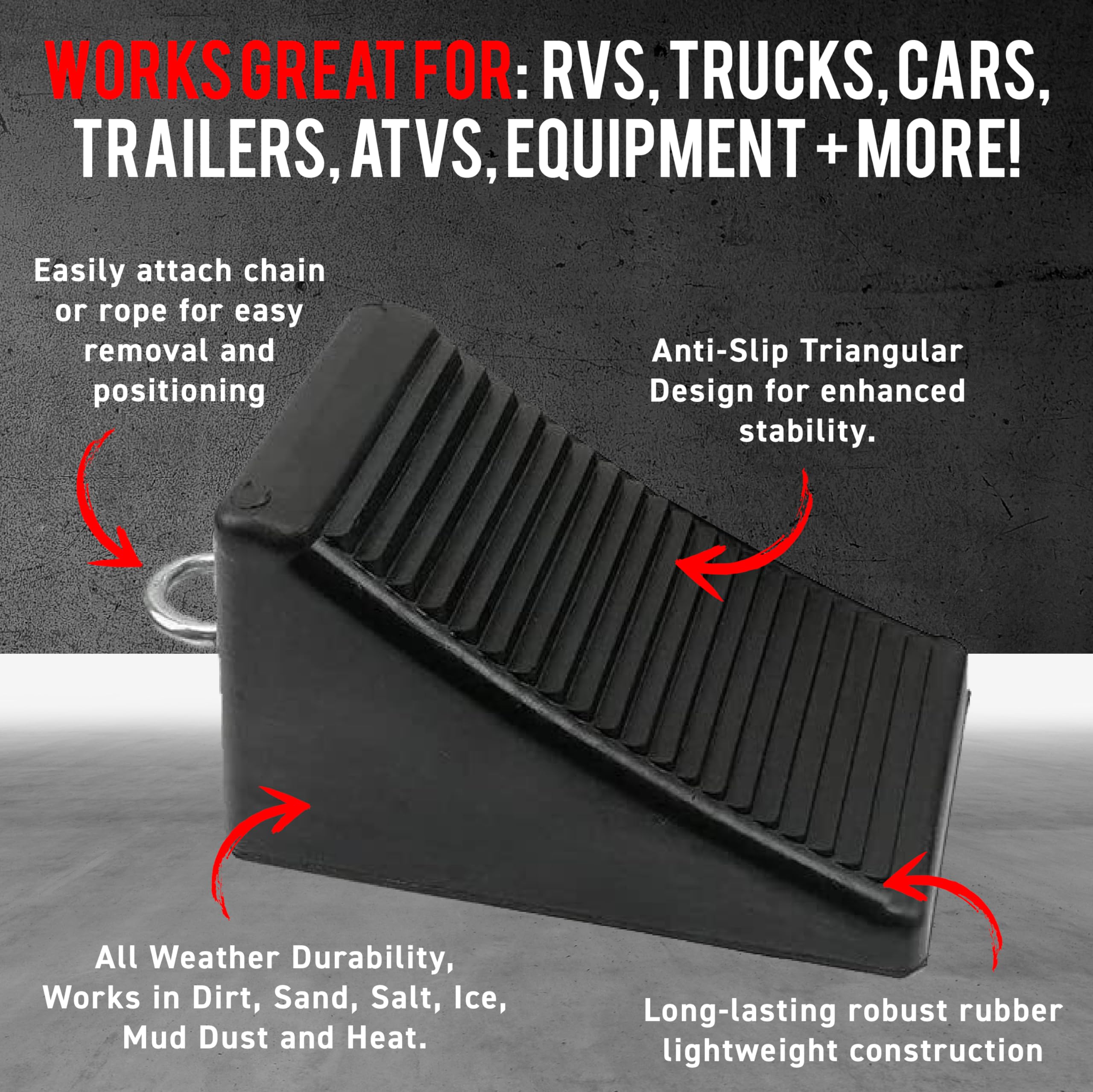 2. JUEGO DE CUÑAS DE RUEDA DOBLES: Este paquete de 4 robustas cuñas de rueda te permite asegurar rápidamente un eje completo de neumáticos, tanto delanteros como traseros, para darte la tranquilidad de que tu coche, camión, remolque, ATV o RV se quedará donde lo estacionaste (ya sea remolcado o en el suelo).