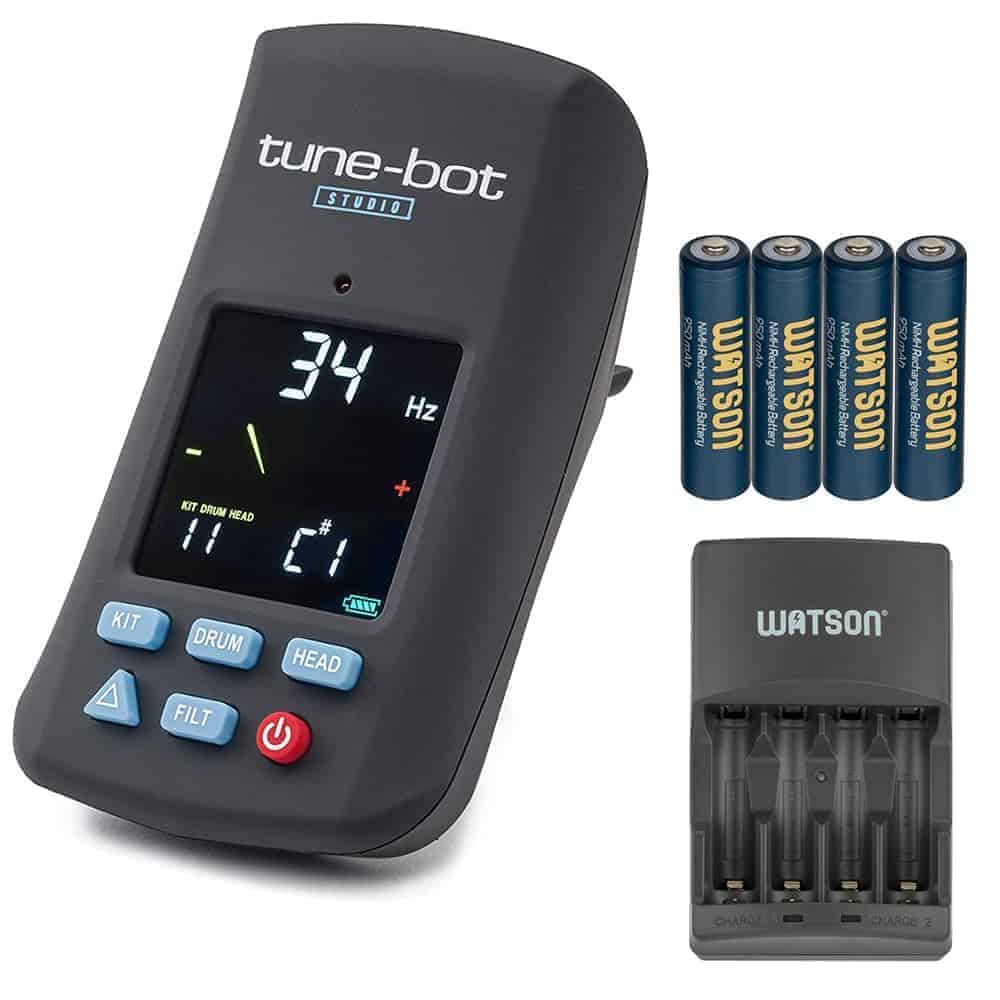 Ya sea que estés cambiando tu kit, tocando en un set que no es tuyo, o simplemente experimentando con diferentes tonos de batería, puedes afinar rápidamente tu set a un sonido que hayas usado antes. El Tune-Bot te permite guardar y recordar el tono para 5 kits con hasta 10 tambores cada uno, lo que te permite tener consistencia en la forma en que suenan tus tambores. Una aguja virtual de afinación cambia de color de amarillo a rojo, indicándote cuán plano o agudo está el tono en relación a la frecuencia objetivo. Incluye un paquete con Baterías Recargables Watson AAA NiMH (950mAh, 1.2V, 4-Pack) y Cargador Rápido AA-C4H de 4 horas.