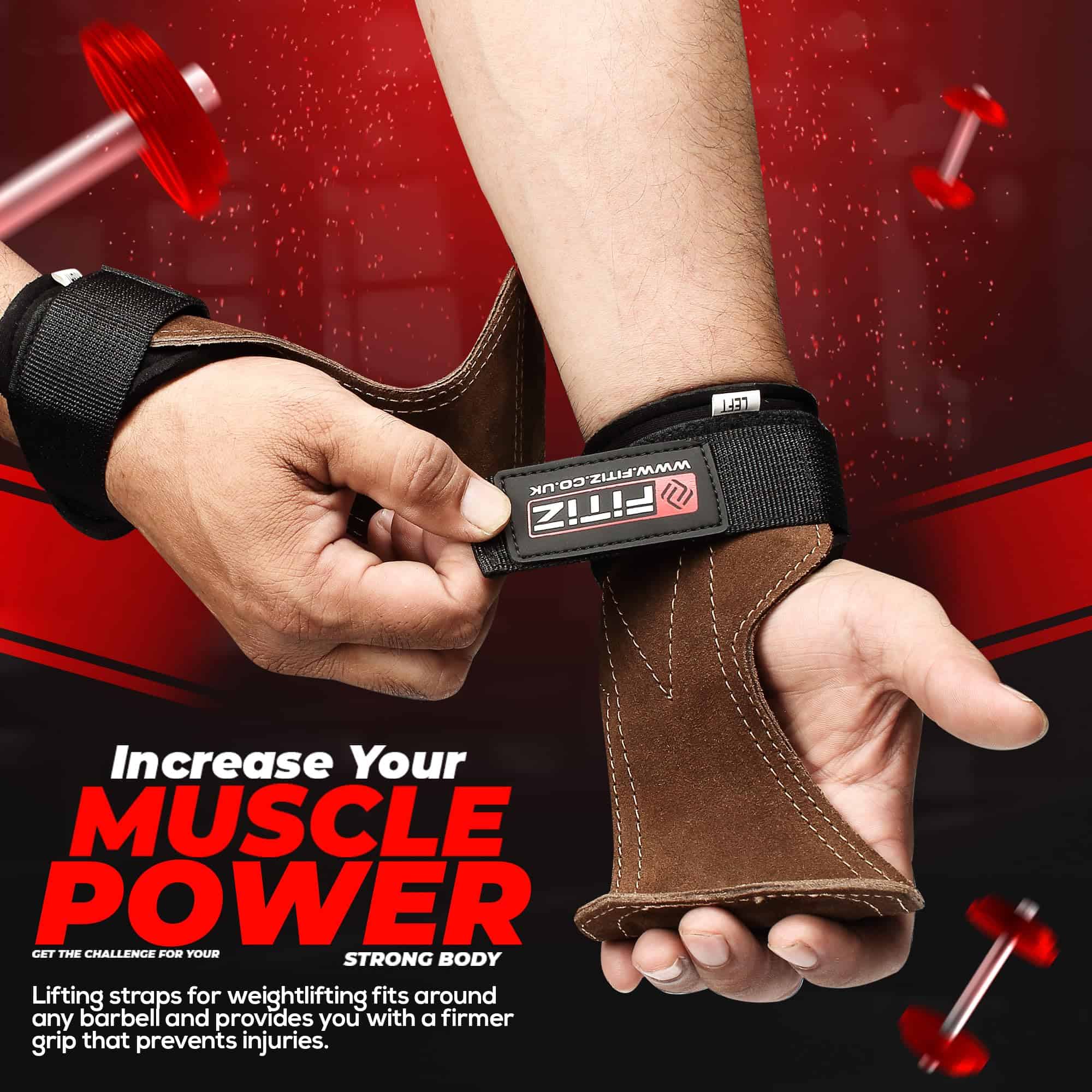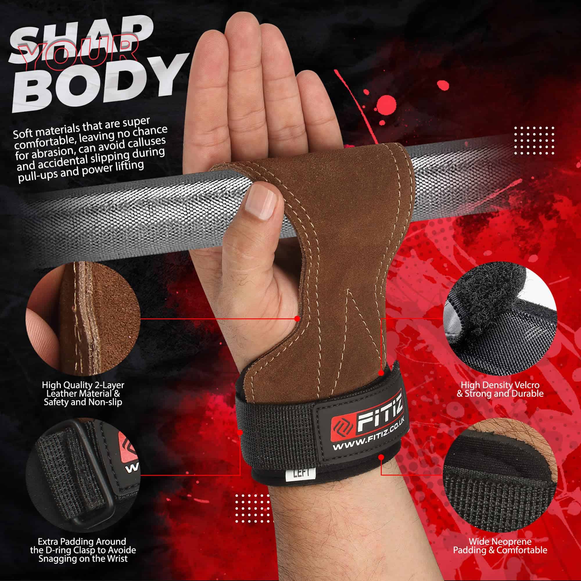 Agarres de Cuero FITIZ para Levantamiento de Pesas que combinan las mejores cualidades en agarres de levantamiento en un par. Los Agarres FITIZ están construidos a partir de tres capas de cuero de vaca premium y súper duradero. Integrada en la sección de los dedos de los agarres hay una capa de gel para asegurar su agarre.