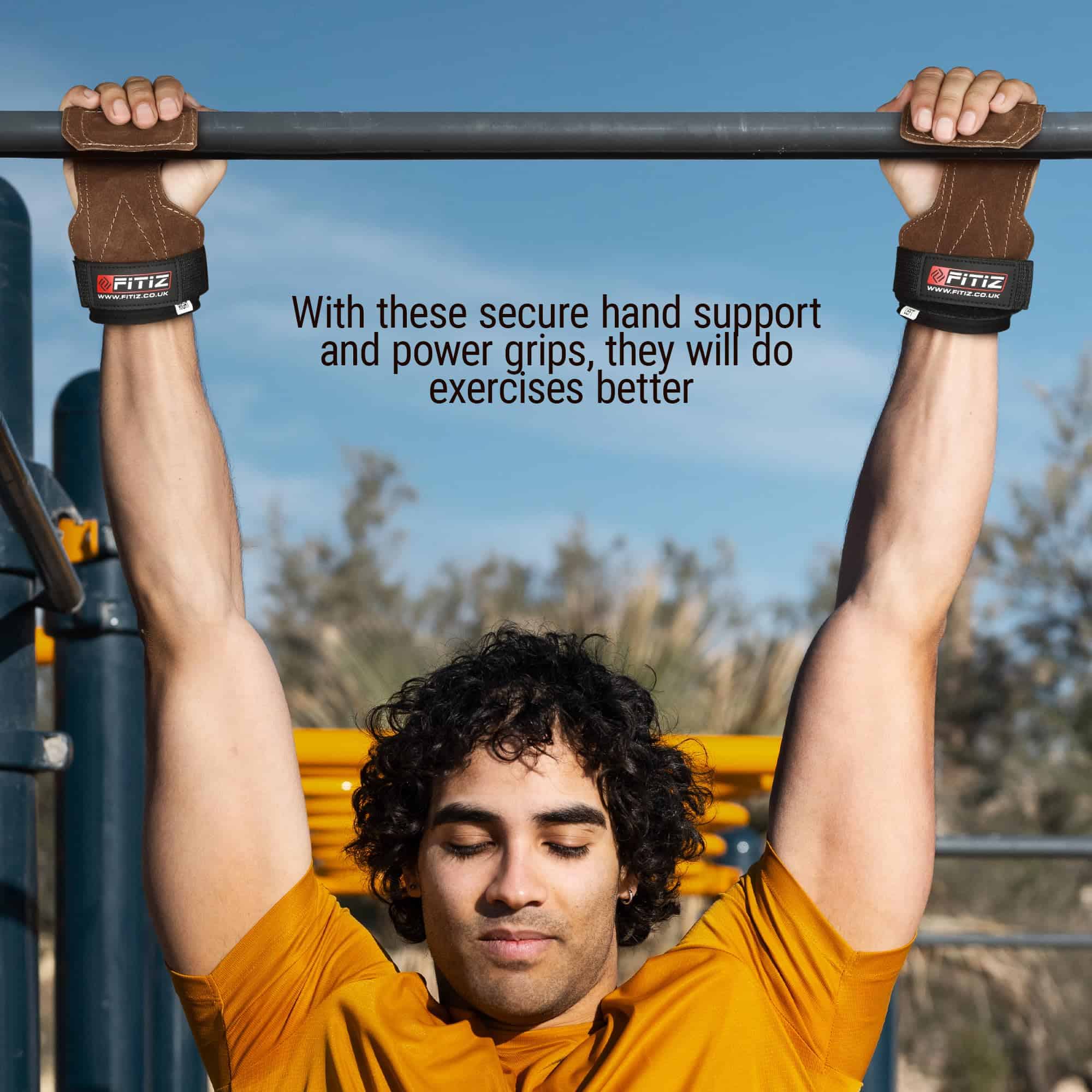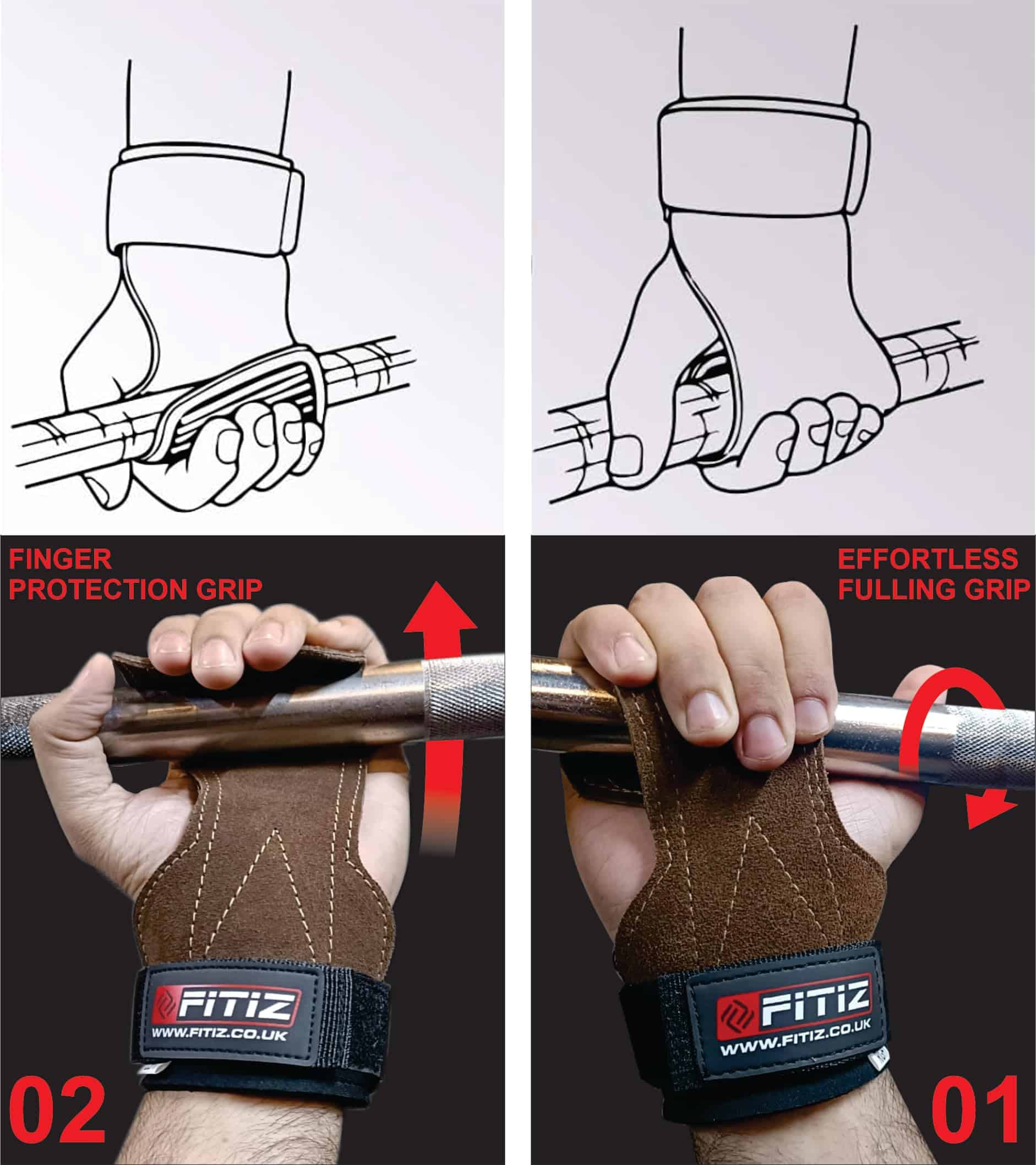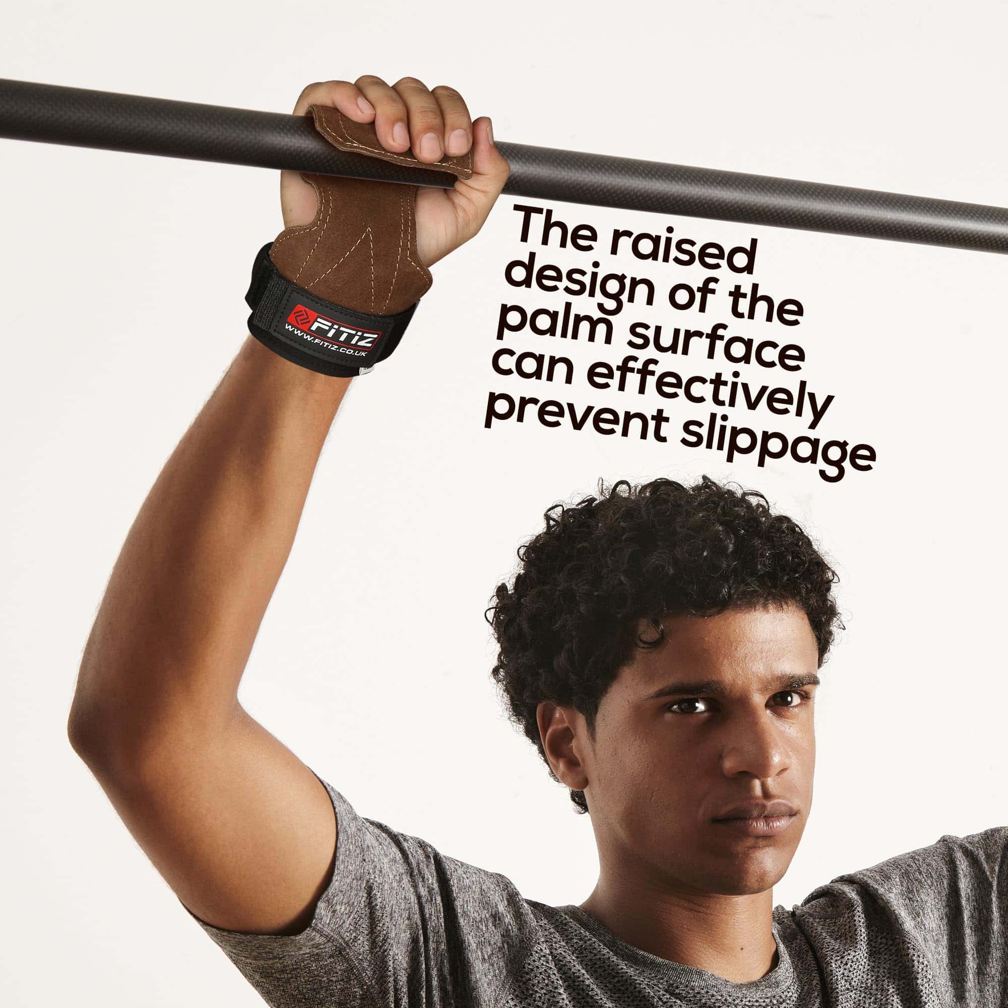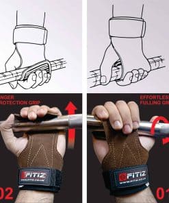 Ya sea que estés realizando dominadas, encogimientos, peso muerto u otros movimientos de tracción, los Agarres FITIZ brindan el máximo soporte. Cuando estés listo para comenzar el ejercicio de tracción, simplemente coloca el Agarre FITIZ frente a tu palma mientras posicionas la barra de levantamiento de peso entre tu palma y la zona de agarre. Usa las puntas de tus dedos dentro del Agarre FITIZ para doblar el agarre sobre la barra, de modo que el agarre descanse entre la barra y la palma de tu mano. Agarra la barra como lo harías sin los Agarres FITIZ puestos. ¡Es tan fácil como eso!