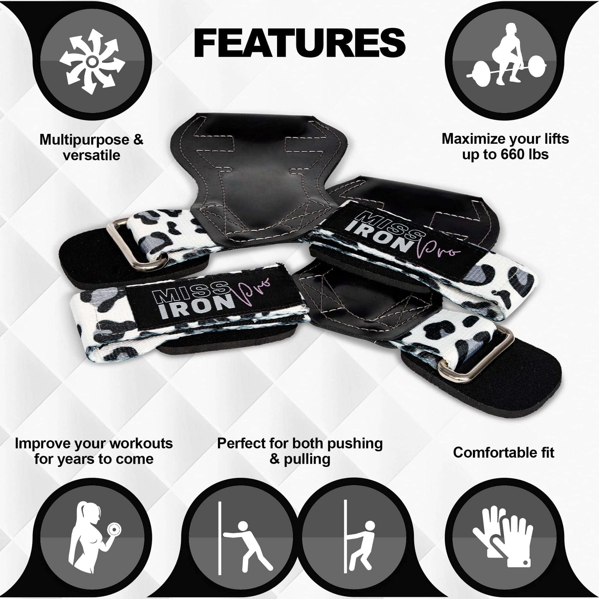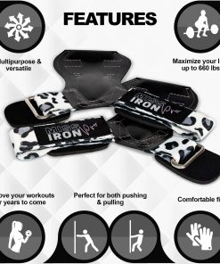 Los agarres de levantamiento de pesas para mujeres son el accesorio perfecto para mejorar tu rendimiento en el gimnasio. Con un diseño de estampado de leopardo y colores blanco, negro y gris, estas correas de muñeca premium brindan un soporte ajustable para levantamientos de pesas, culturismo y peso muerto. Además, su acolchado ayuda a proteger tus manos durante los entrenamientos intensos. ¡Potencia tu rutina de ejercicios con estos guantes de levantamiento de pesas de alta calidad!