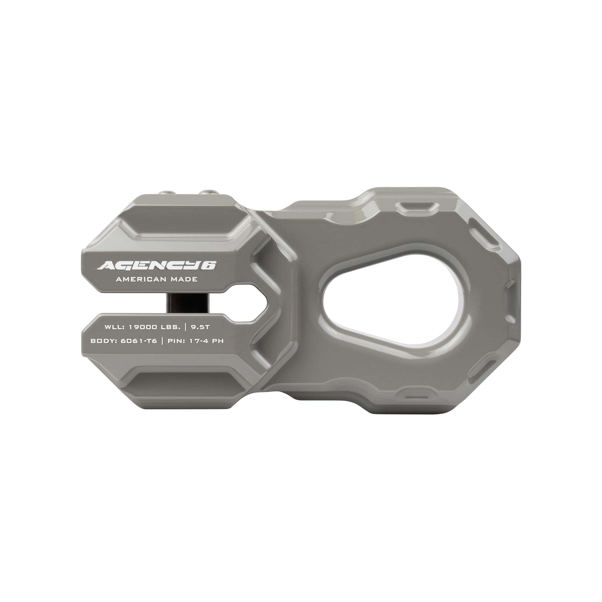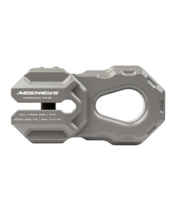 Agency 6 Billet Winch Shackle: Accesorio de cabrestante de fácil mantenimiento hecho de aluminio mecanizado CNC 6061 T6 certificado por EEUU con un pasador de acero inoxidable endurecido 17-4. Diseño ligero con un límite de carga de trabajo de 19,000 lbs capaz de operaciones de recuperación estándar en situaciones off-road. La cubierta integrada minimiza la abrasión y el daño por UV a la línea sintética. Permanece con un aspecto excelente gracias al recubrimiento resistente a la abrasión y a los rayos UV. No exceda el límite de carga de trabajo más bajo (WLL) de ningún componente (por ejemplo: vehículo, recepción del enganche, shackle, etc) – Acabado: Recubrimiento en polvo terrestre – Parte BWS-GRY Hecho en EEUU.