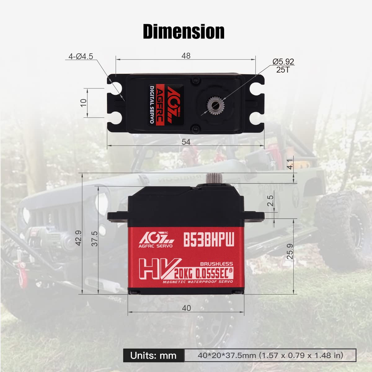 AGFRC B53BHPW se actualiza a 20KG de alto torque y 0.055Seg de velocidad. La apariencia adopta el diseño de carcasa intermedia de aluminio y el nuevo grabado láser, y admite la función de parámetros programables. Y el sensor magnético impermeable alcanza la clasificación IP67, que se puede utilizar en entornos adversos como días lluviosos, fangosos, dunas de arena, nieve, arroyos e humedad. Además, su estructura interna se ha actualizado por completo desde el motor hasta los engranajes. El engranaje de acero está hecho de material de acero resistente y el eje está reforzado a 2.0mm, lo que es más fuerte y confiable.