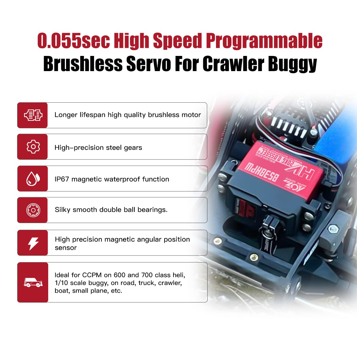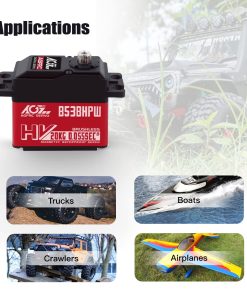 Características: Engranaje de acero de alta precisión, motor brushless de alta calidad, rodamientos de bolas dobles de alta resistencia disponibles para programación de parámetros, sensor magnético de alta precisión, impermeable IP67, ideal para On Road, Off Road, Truck, Buggy, Airplane, Helicopter y Engine, etc.