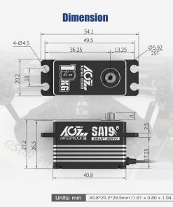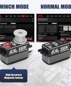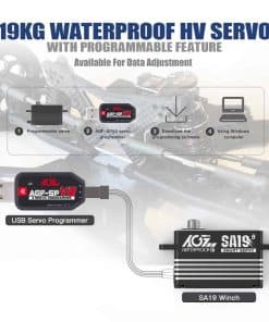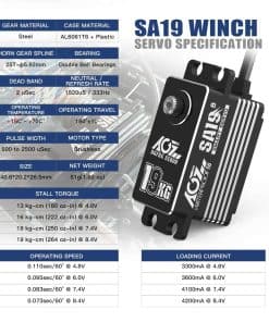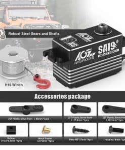 El servo inteligente de winch de bajo perfil de 2S AGFRC SA19 ha preestablecido un firmware de winch continuo de 360 grados (sin número fijo de vueltas), lo que permitió cambiar a firmware para uso de winch y servo regular a través del programador de servo AGF-SPV3 (no incluido). La respuesta rápida de 0.073seg y el increíble par de 19kg lo convierten en una combinación perfecta para aquellos que exigen lo mejor para su coche de turismo o aplicación todoterreno de 1/10. El diseño de la carcasa del disipador de calor no solo se ve bien, sino que también permite temperaturas de funcionamiento más frescas y más suaves. Características 2S Low Profile Smart Servo Aluminium CNC top and middle aluminum Case High Reliability Steel Gear Programmable Digital Circuit More Durable 2 Ball Bearings Good Stability Brushless Motor Magnetic Sensor Waterproof IP67 Can be used as a Winch or Regular Servo Ideal for 1/10, 1/12 On Road, Off Road, Touring, Drifting, Airplanes, Boats, Robot etc. Recordatorio amable: El programador de servo USB no está incluido. Si necesita el programador, busque el Asin: B09NR1KPM6 Torque de bloqueo 13 kg-cm (181 oz-in) @ 4.8V 16 kg-cm (223 oz-in) @ 6.0V 18 kg-cm (250 oz-in) @ 7.4V 19 kg-cm (265 oz-in) @ 8.4V Velocidad de funcionamiento 0.110seg/60 @ 4.8V 0.095seg/60 @ 6.0V 0.083seg/60 @ 7.4V 0.073seg/60 @ 8.4V Especificaciones del servo Marca: AGFRC Artículo: SA19 Winch Sistema de Control: PWM, 1520uS/333hz Motor: sin escobillas Engranaje: Acero de alta resistencia Banda muerta: 2 uSeg Viaje de operación: 180 10 , cuando 500 a 2500 uSec Rodamiento: Doble rodamiento de bolas Material de la caja: Aluminio + Plástico Tamaño: 40.8 20.2 26.5mm Peso: 51g Cable: JR 180mm / 22AWG Paquete incluido 1 x AGFRC SA19 RC Winch Servo 1 x H16 Metal Servo Winch 1 x Kit de Accesorios