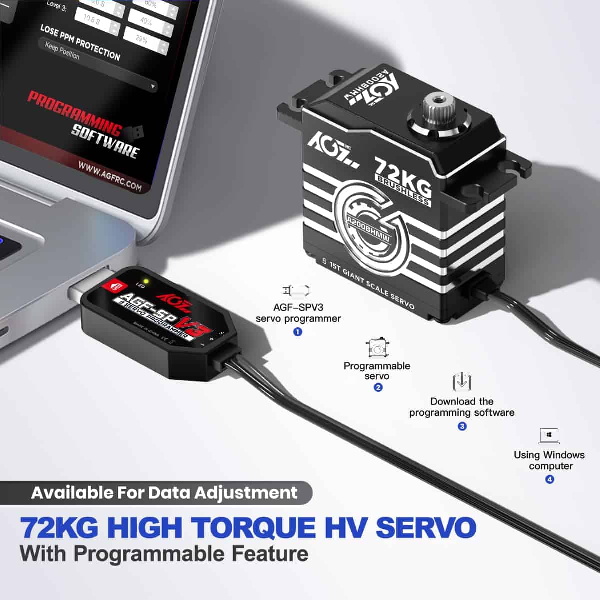 1. Programmable – Este servo de alta velocidad a escala 1/6 es programable mediante el programador de servo AGF-SPV3 (no incluido) para cambiar el torque, velocidad, ángulo, inversión, posición neutral, etc.