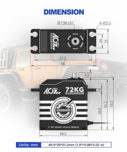 5. Aplicación y Dimensiones – Ideal para la mayoría de los coches RC a escala 1/5, 1/6, buggies, camiones monstruo, crawlers, barcos, en carretera, fuera de carretera, aeronaves de gran escala, máquinas industriales, robots, etc. Tamaño: 48.5 25 51.2mm (1.91 0.98 2.02 pulgadas)
