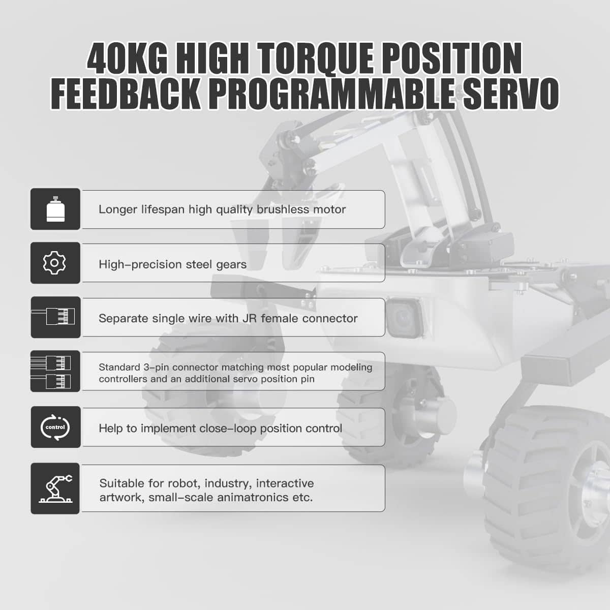 AGFRC IB53BHU es un servo de tamaño estándar que proporciona acceso al potenciómetro de retroalimentación a través del cable naranja adicional cuarto, que es capaz de medir directamente el ángulo de salida. Con la función de retroalimentación de posición, puedes asegurarte de que el servo ha alcanzado su posición designada o detectar posibles impedimentos, por supuesto, esto permite un control adicional de lazo cerrado desde tu controlador. Facilita aplicaciones más complejas de robótica o industria, como determinar cuándo el servo ha alcanzado su objetivo, detectar cuando la salida está bloqueada o implementar tu propio control de posición de lazo cerrado de nivel más alto.