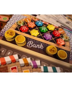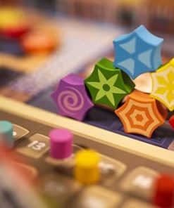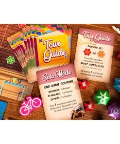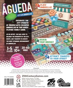 Cada verano, la ciudad de Águeda Portugal se transforma en un hermoso festival de arte con sombrillas coloridas colgadas sobre las calles y farolas decoradas, murales y otras instalaciones artísticas alrededor de esta pintoresca ciudad. En «Águeda: Ciudad de Paraguas», los jugadores asumirán el papel de artistas de festivales decorando las calles de la ciudad con sus propios paraguas coloridos para atraer a la mayoría de turistas a sus calles. Como artista, deberás equilibrar las solicitudes de la ciudad, las tiendas y los turistas para crear la formación más impresionante de paraguas. Los jugadores seleccionarán azulejos de un tablero central, colocándolos en una fila en su tablero de calles de jugador. Después de poner tus paraguas, seleccionarás uno o dos turistas y los moverás a una de tus tres filas de paraguas para puntuar esa fila. La colocación cuidadosa de tus paraguas desbloqueará secciones de tu mapa turístico, que agregarán más turistas a tu reserva para colocar en tu tablero. Una vez que un jugador haya llenado su tablero, la puntuación de tu disposición de paraguas se basará tanto en las reglas de colocación de puntuación estándar del tablero como en las cartas comunales de «Tienda» con objetivos de puntuación variables. «Águeda: Ciudad de Paraguas» es un juego para 1 a 5 jugadores e está inspirado en el festival anual de la vida real en Águeda Portugal llamado el Proyecto de los Paraguas en el Cielo. 25th Century Games colaboró con el Proyecto de Paraguas en el Cielo para ilustrar la portada de la caja, incorporar sus mapas turísticos anuales en el juego y para consultoría cultural.