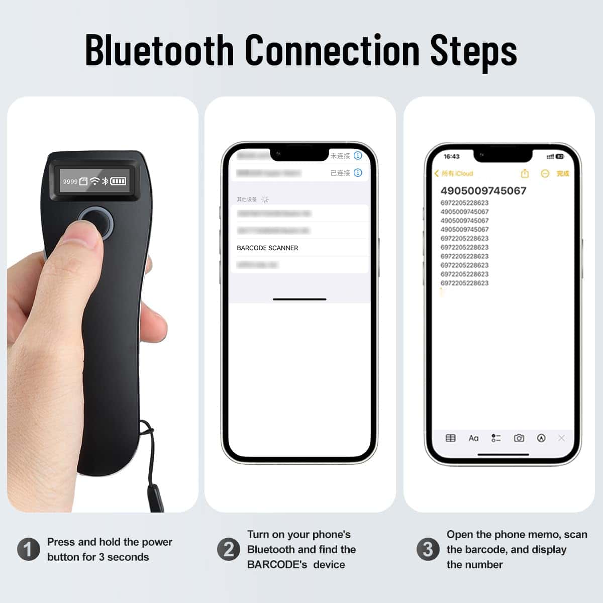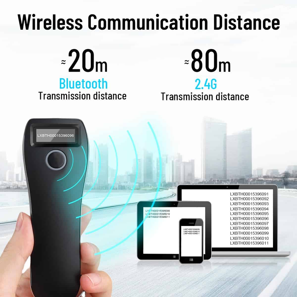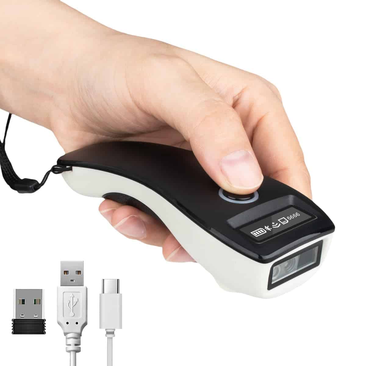 Escáner de código de barras inalámbrico con conexión 3 en 1: diseño de conexión Bluetooth compatible; receptor de conexión inalámbrica 2.4G; conexión por cable USB, fácil de conectar a su computadora portátil, PC, teléfono, tableta iphone ipad POS. Adecuado para Windows XP/7/8/10 Mac OS Windows mobile Android OS iOS. Transmisión de larga distancia: el escáner de código de barras inalámbrico tiene una distancia de transmisión de aproximadamente 80 metros en áreas exteriores (la distancia de transmisión en interiores generalmente es de 20 a 30 metros dependiendo de diferentes estructuras y entornos). Decodificación 1D: EAN- 13, EAN-8, UPC-A, UPC-E, ISSN, ISBN, CodaBar, Code 128, Code93, Interleaved 2 de 5, Industrial 2 de 5, Matrix 2 de 5, GS1 Databar(RSS), Code 39, Code 11, MSI-Plessey, etc. 2D: Código QR, Data Matrix, PDF417, Micro QR, Aztec, etc. Soporta la lectura de códigos de pantalla de teléfono móvil. Diseño de ahorro de batería: El escáner de código de barras está equipado con una batería recargable con un tiempo de carga de 2 horas, que puede funcionar de forma continua durante 12 horas y tiene un tiempo de espera super largo de 5 días. El escáner de código de barras se apaga automáticamente después de 1 minuto de inactividad.