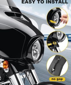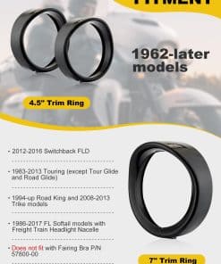 Compatibilidad – Diseñado para adaptarse a una variedad de modelos de bicicletas Harley Davidson, este juego de viseras de anillo de guarnición de faro y luces de niebla agrega un toque estilizado a su motocicleta mientras mejora la apariencia del frente. El diseño actualizado sin espacio proporciona una apariencia de faros inclinados, lo que hace que las luces sean más delgadas y profundas para una apariencia más atractiva.