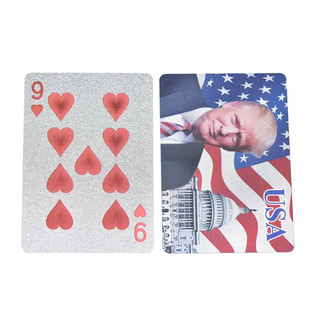 Baraja de cartas de alta calidad con foil plateado y una superficie profundamente realzada con el Presidente de los Estados Unidos, Donald Trump, impreso en ella. Incluye 52 cartas de juego y 2 cartas de comodín. Hechas de papel superb, ecológico, impreso y laminado de manera excelente para garantizar que estas cartas funcionen de manera excelente para ti. Los bordes son suaves y difíciles de romper, y puedes barajarlas fácilmente. Las cartas de juego son ideales para todos los juegos de cartas: bridge, go fish, póker, euchre, corazones, blackjack, canasta, texas, pinochle, baccarat, noches de casino y más.