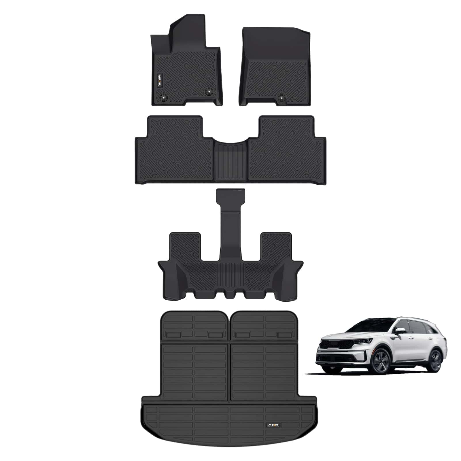 CUSTOM FIT AIPOIL Floor Mats and Cargo Liner Custom for 2021-2025 Kia Sorento Hybrid & 2022-2025 Sorento Plug-in Hybrid 6/7 Passenger, For fit Kia Sorento Sorento Plug-in Hybrid 2022 2023 2024. Car floor mats include front row, rear row, and trunk liner. 3D laser scanning technology is used to accurately scan the original car data. More importantly, details such as the accelerator and brake have been paid attention to during the design process, which will not affect your driving.