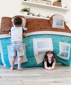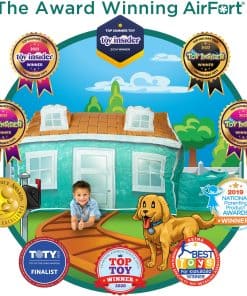 AIR FORT – ¡Si necesitas un descanso de las fortalezas de muebles desordenadas, tenemos la solución! ¡El AIR FORT es la primera fortaleza para niños en llegar al mercado que se infla en segundos con el interruptor de un ventilador ordinario de hogar. Cuando se infla, el AIR FORT es grande en tamaño y puede acomodar a varios niños y adultos. Cuando se desinfla, el AIR FORT se guarda en su propia bolsa de transporte a juego del tamaño de un par de jeans doblados, ¡no ocupando espacio de almacenamiento! ¡Diviértete en la fortaleza más ‘cool’ que hayas construido! La Fortaleza de Juego Instantánea El AIR FORT se infla en menos de 30 segundos. Cuando los niños estén listos para jugar, simplemente coloca tu AIR FORT en un ventilador y ¡listo! No se necesitan cojines, mantas, almohadas. Crea una fortaleza sin desorden rápida y fácilmente. Cuando llegue la hora de dormir, a menos que una fiesta de pijamas lo demande, todo lo que debes hacer es guardar tu AIR FORT en su bolsa de transporte a juego y listo. La bolsa de transporte es pequeña, ocupando casi ningún espacio de almacenamiento. El AIR FORT es genial para llevarlo a la casa de un amigo o llevarlo en un viaje en carretera familiar. ¡A los niños les encanta, pero los adultos podrían amarlo aún más porque es fácil de configurar y aún más fácil de guardar! ¡Además, el AIR FORT está probado y aprobado en cuanto a seguridad infantil! Una Gran Fortaleza en un Pequeño Paquete Con 6,5 pies de diámetro y más de 4 pies de altura, el AIR FORT es lo suficientemente grande para caber varios niños y adultos. Lo suficientemente grande para los niños y sus juguetes, mantas, almohadas y juegos. El tamaño perfecto de fortaleza para fomentar horas de diversión y tiempo de juego independiente. ¡Una gran fortaleza que cabe en un paquete pequeño, realmente importante cuando llega el momento de guardar tu AIR FORT! Hecho de tela ligera y transpirable, el AIR FORT, cuando se guarda de nuevo en su bolsa de transporte a juego, ¡pesa solo 24 oz. y es más pequeño que un par de jeans doblados!