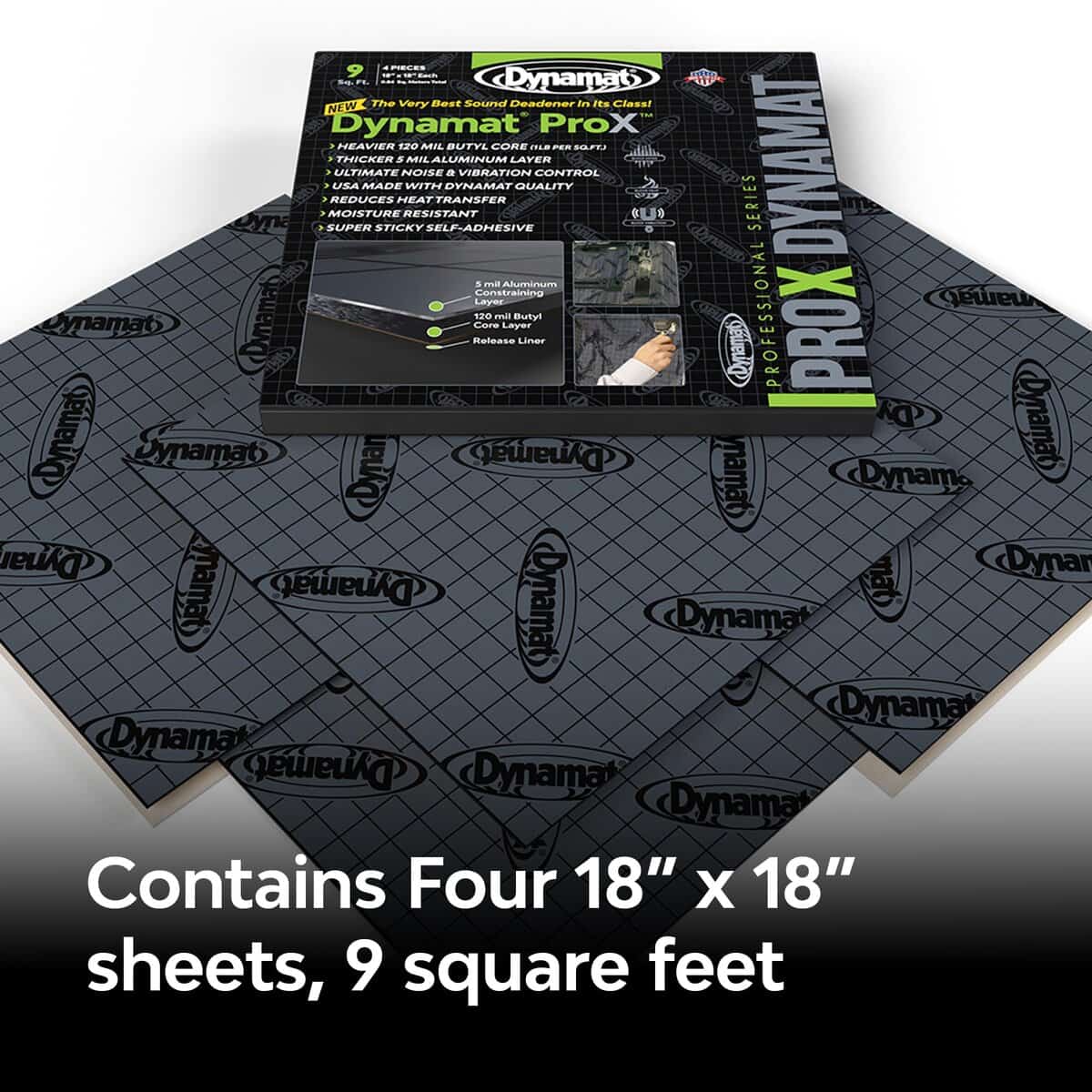 El paquete contiene cuatro hojas de 18 x 18 pulgadas, lo que equivale a 9 pies cuadrados de Dynamat ProX, más que suficiente para cubrir áreas clave en tu automóvil y disfrutar de un viaje más silencioso y fresco.