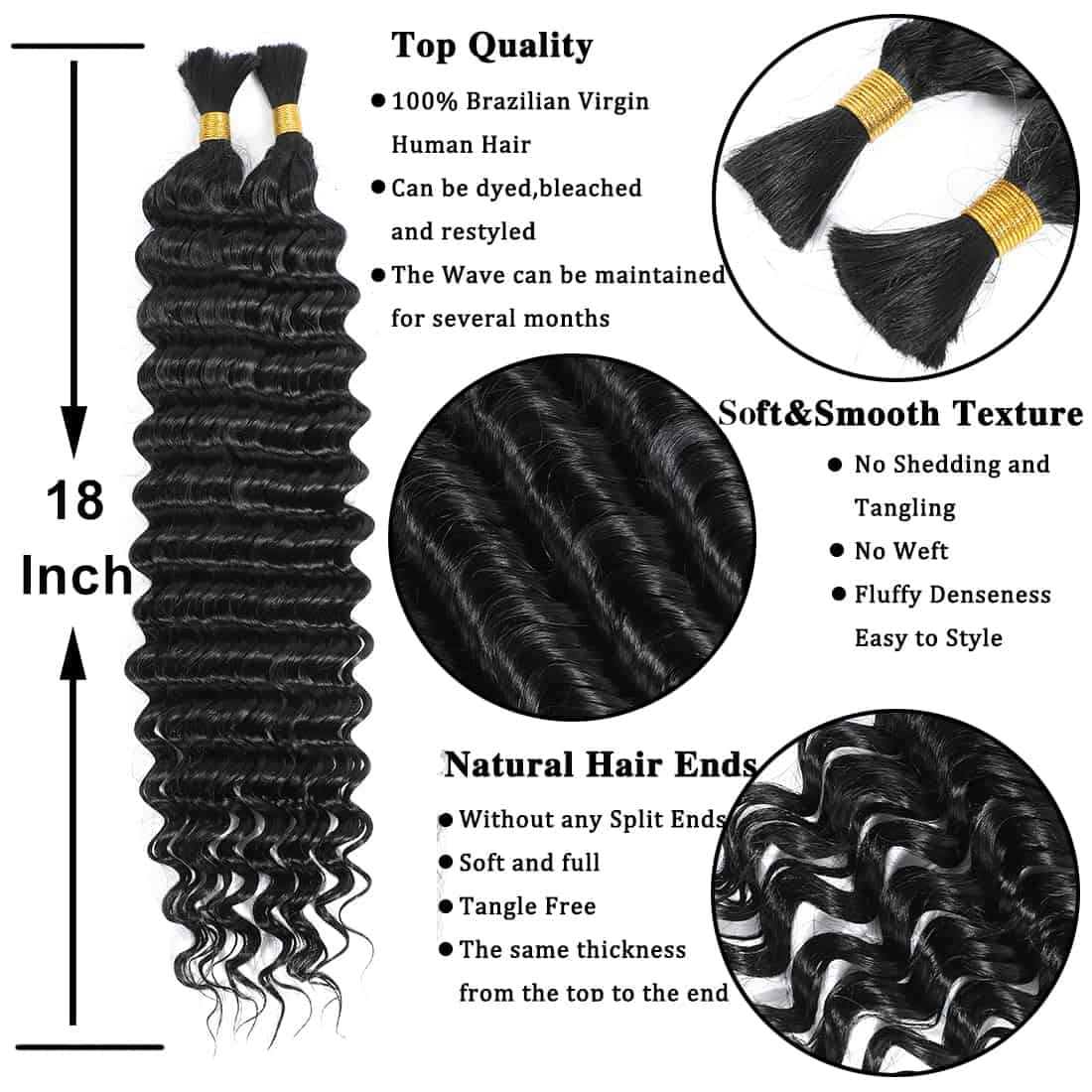 Material de extensión de cabello humano a granel para trenzado con ondas profundas 100% natural sin procesar. Negro Natural. Longitud de 18 pulgadas. Peso de 100g (+/-5g) por paquete. No tiene trama, no se enreda, no se cae. Las extensiones de cabello son suaves y sedosas, tu cuero cabelludo no se verá afectado. Cabello de trenzado humano AIVICO muy limpio, natural, suave y fácil de trenzar. Se puede hacer diferentes estilos según tus preferencias, como trenzas sin nudos, trenzas bohemias, cabello en chal, cola de caballo. Jamás pasarás desapercibida. Sin puntas abiertas. Se puede alisar, teñir, decolorar, rizar y reestilizar. Puede aplicarse en diferentes ocasiones: fiestas de cumpleaños, bodas, citas, desfiles de moda, fiestas temáticas, conciertos, etc. Imagina que destacarás en cualquier ocasión si eliges nuestro producto. Da forma a tu cabello de diversas maneras para mostrar tu belleza y encanto. Diseño único. La extensión de cabello trenzado ondulado es la más adecuada para trenzar, ya que no tiene trama y no dañará tu cuero cabelludo, es suave y sedosa. Siéntete libre de consultarnos, recibirás una respuesta satisfactoria. También te invitamos a señalar nuestras deficiencias, las corregiremos activamente.