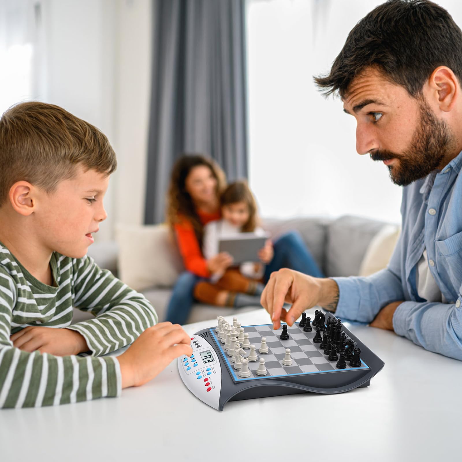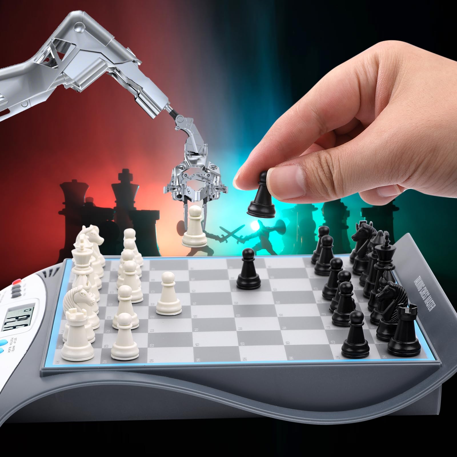 4. JUEGO DE AJEDREZ ELECTRÓNICO FÁCIL DE USAR: Tablero de ajedrez altamente sensible para hacer movimientos presionando ligeramente en las casillas. Dígitos LCD grandes fáciles para leer los movimientos. Piezas de ajedrez magnéticas fáciles de colocar en pie. Retroceda todos los movimientos hasta la posición inicial. Cambie de lado con la IA. Siga los movimientos de la computadora. Volumen de sonido ajustable.