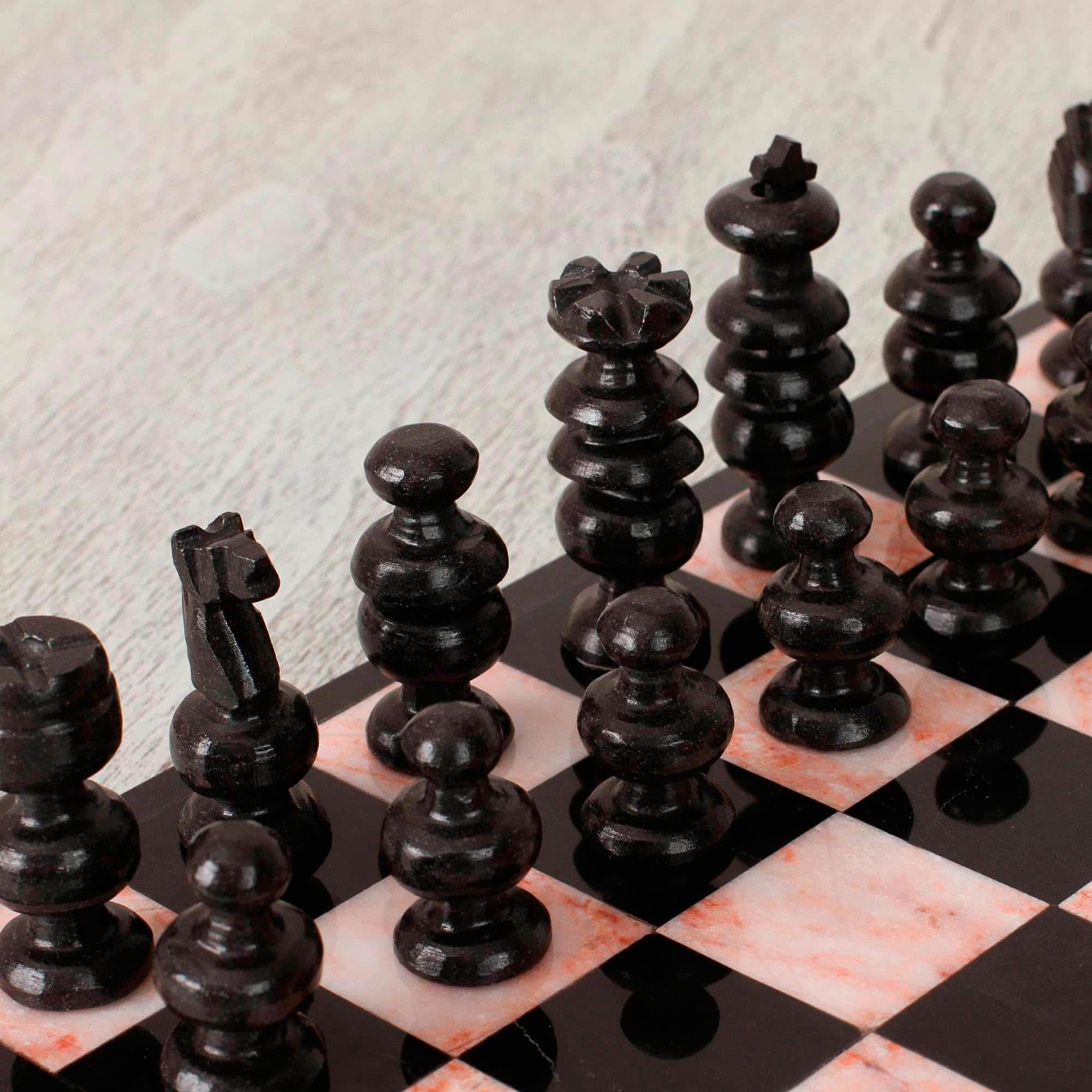 NOVICA, en asociación con National Geographic, trabaja junto a talentosos diseñadores artesanos de todo el mundo para producir impresionantes tesoros dignos de conservar. Nuestro lema es difundir la felicidad global, así que tenga la seguridad de que haremos todo lo posible para asegurarnos de que sea un cliente feliz. Sobre este artículo: La antigua fuerza de la piedra atestigua los desafíos enfrentados por el fanático del ajedrez. Esculpido en mármol negro y rosa ricamente veteados, este extraordinario juego de ajedrez aporta un toque de lujo al juego. Es un diseño de la Familia Sierra de México. – Piedra natural – se esperan algunas variaciones en color y/o patrón Sobre nuestra artista: Odette Sierra de México y su padre, Edgar Sierra, abrieron su taller hace 30 años. Sumergidos en esta herencia artística, los Sierra comenzaron a elaborar mesas de parquet en ónix y mármol. El arte de esculpir mármol y ónix requiere paciencia y virtud, ambas cultivadas con el tiempo en el taller de la Familia Sierra.
