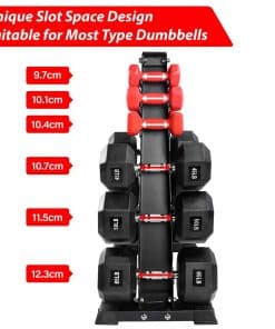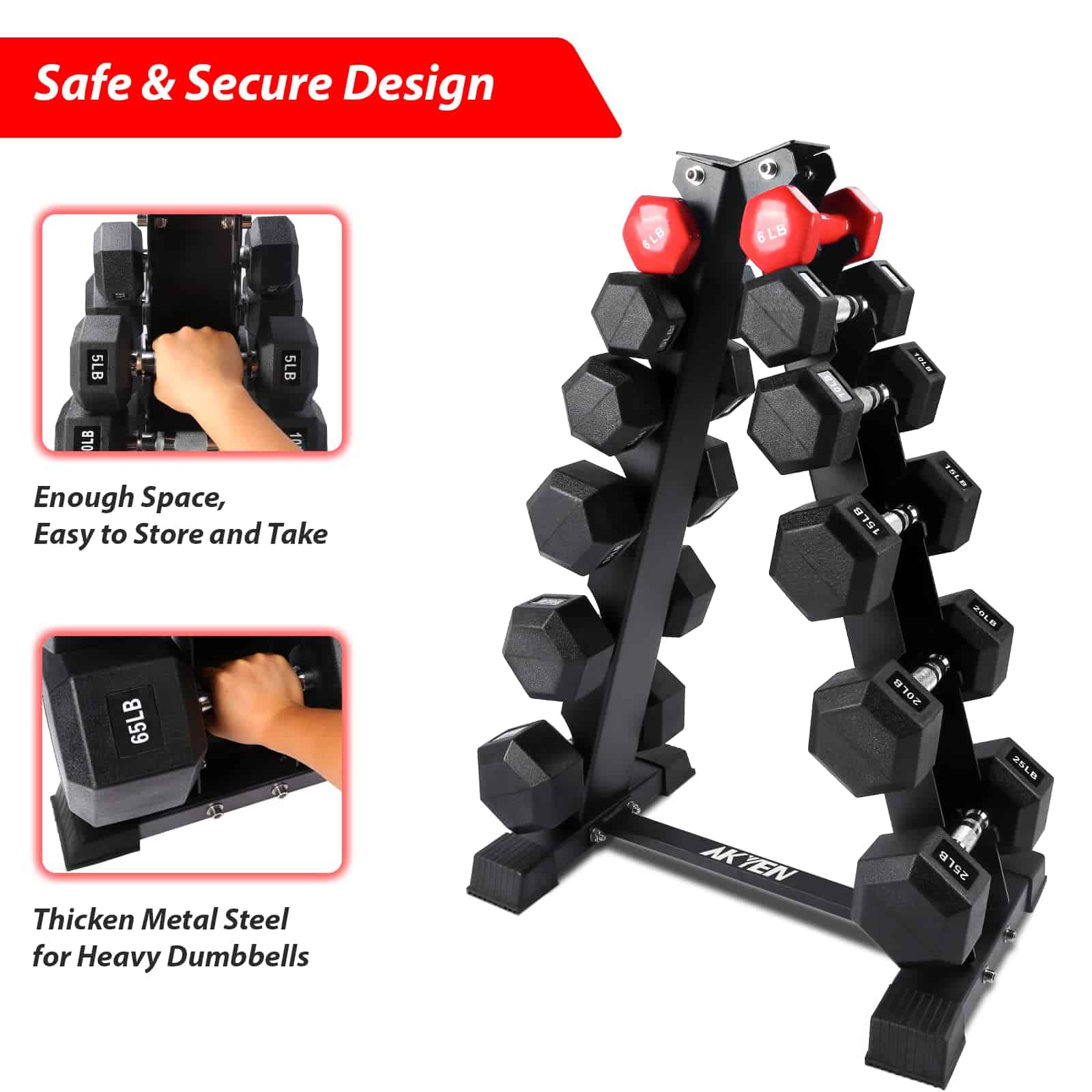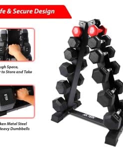 El soporte para pesas AKYEN es la solución perfecta para mantener tu área de entrenamiento organizada y segura. Construido con tubos de acero de alta calidad y un recubrimiento en polvo negro, este soporte es muy duradero y fiable, sin riesgo de que se agriete o tambalee. El diseño en forma de A ocupa menos espacio y almacena más mancuernas, lo que te permite acceder y almacenar fácilmente tus pesas. Las cubiertas de goma evitan daños en tus mancuernas, y las tapas de goma de los pies protegen tus suelos. Con un soporte estable y resistente, un ambiente de entrenamiento seguro y cómodo, y un diseño compacto y ahorrador de espacio, el soporte para pesas AKYEN es la elección perfecta para gimnasios, hogares y oficinas.