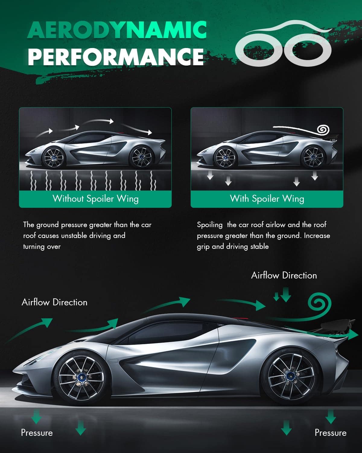 El spoiler trasero empuja la parte trasera del vehículo hacia abajo, por lo que los neumáticos pueden adherirse mejor a la carretera y aumentar la estabilidad.