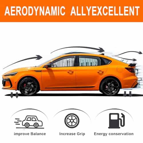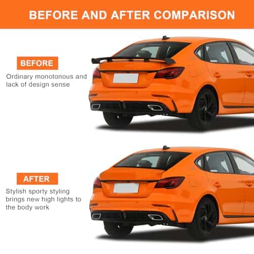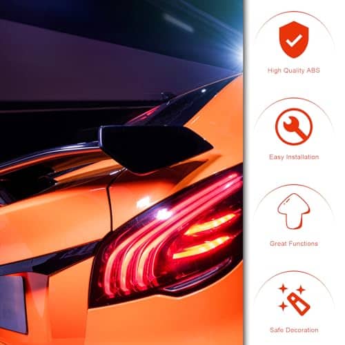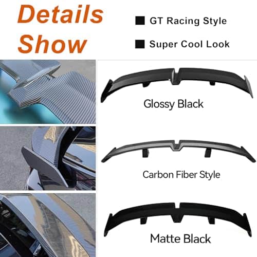 3. Material ABS de Alta Calidad: Fabricado en plástico ABS ligero y duradero, nuestro alerón universal ofrece una excelente resistencia al desgaste e impactos, así como resistencia a la corrosión y al óxido. El acabado negro brillante es resistente a los rayos UV, evitando la decoloración y garantizando una larga vida útil. Su excepcional resistencia al impacto y al calor lo hacen ideal para la conducción a alta velocidad al tiempo que reduce de forma efectiva el impacto de la resistencia al aire.
