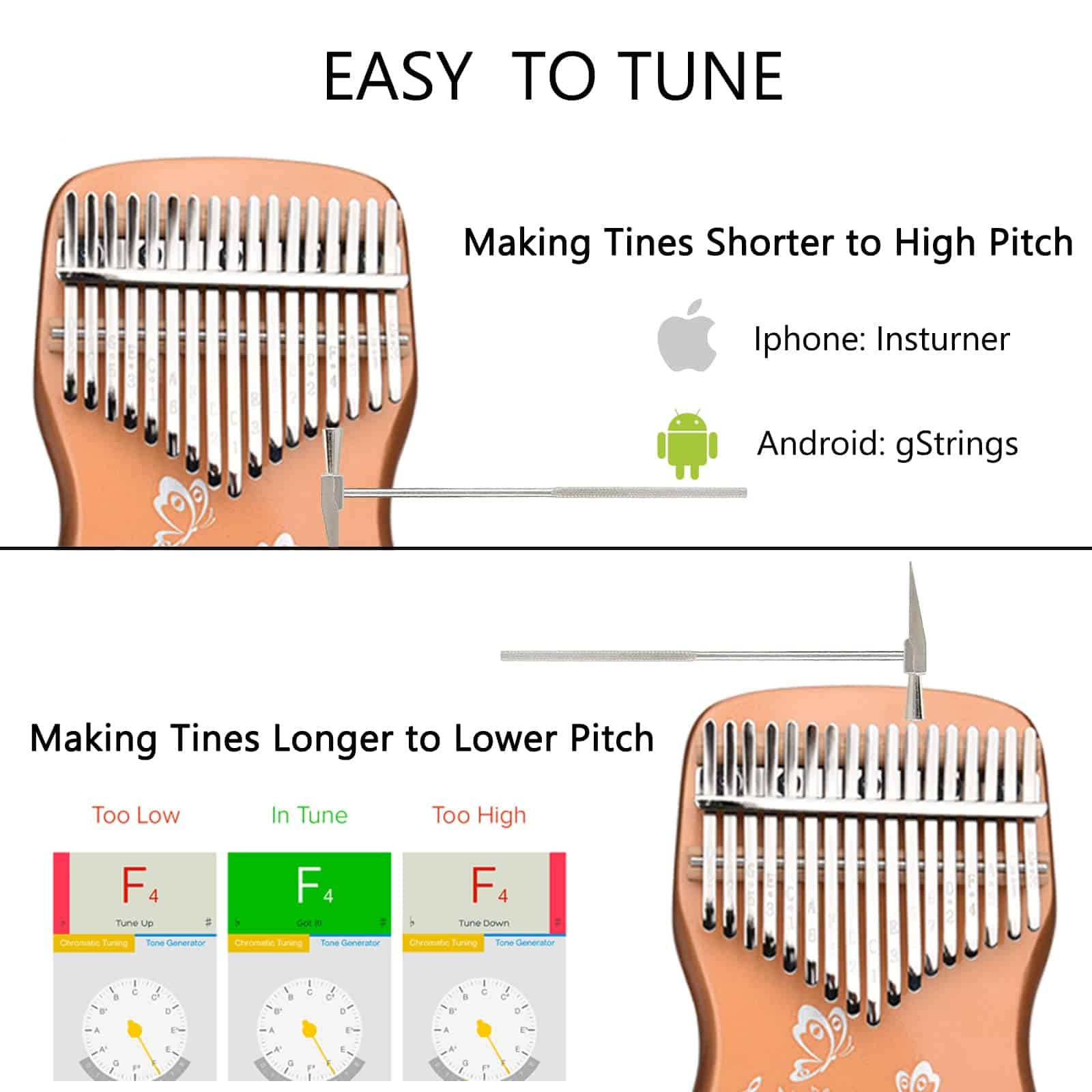 Para mantener tu kalimba sonando bien, usar el martillo de afinación incluido para afinarlo es lo más importante.
