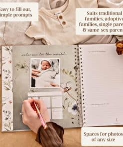 LIBRO DE BEBÉ FÁCIL DE LLENAR: Di adiós a los libros de recuerdos de bebés que son imposibles de terminar (adiós, culpa!). Este es el libro de registro para bebés que realmente terminarás, en tus momentos tranquilos y furtivos. El libro Peachly Fleur para niña contiene simples preguntas abiertas para que no te rompas la cabeza, obligándote a escribir sobre hitos que no significan nada para ti ¡nadie tiene tiempo para eso!.