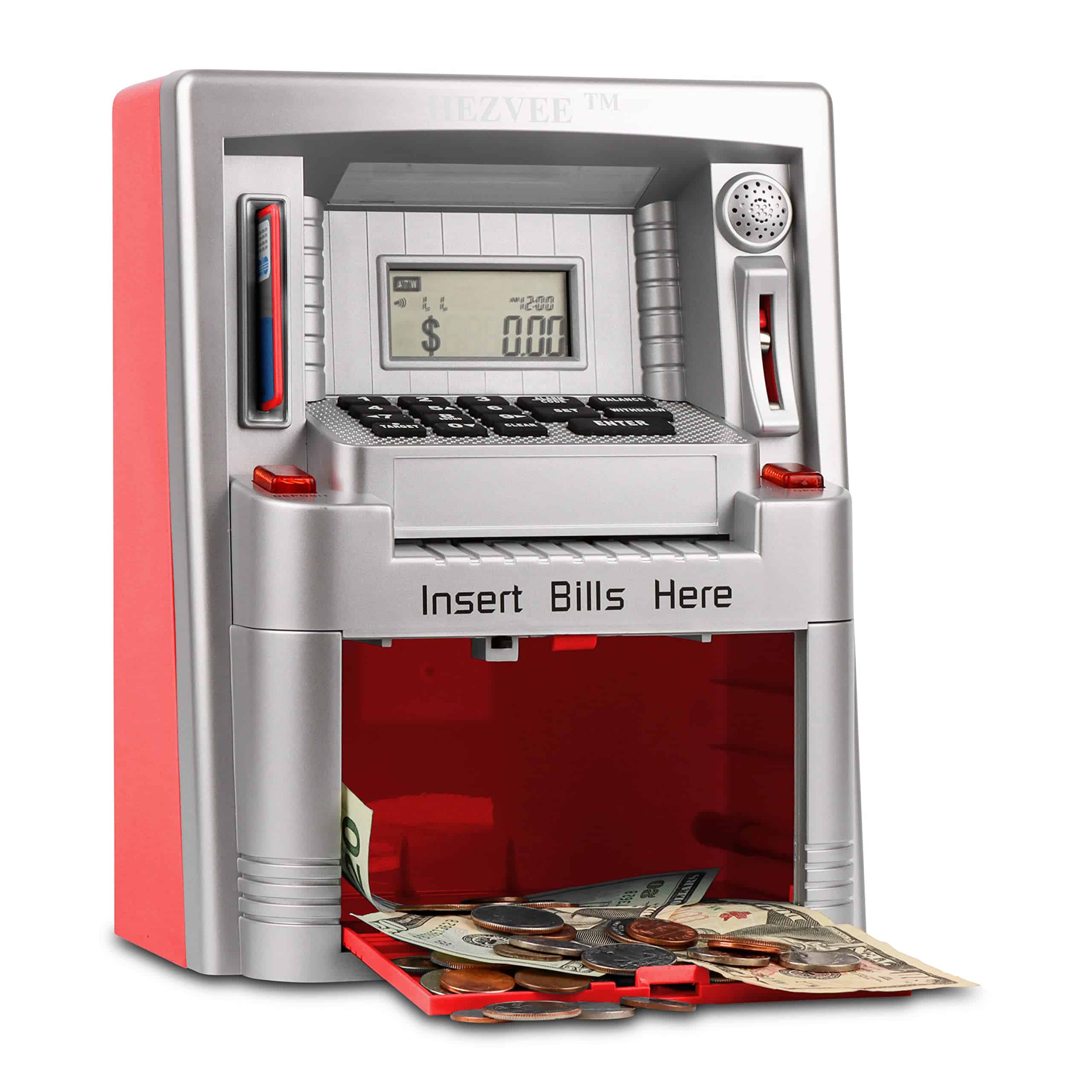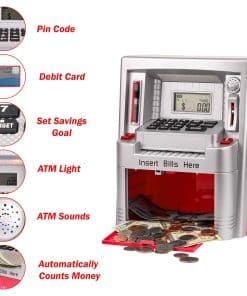 7. MÁQUINA ATM: Al incorporar una máquina ATM en el diseño, esta alcancía es una forma divertida e interactiva de enseñar a los niños sobre la banca y las finanzas. Esta alcancía electrónica viene con tarjeta de débito e instrucciones claras para seguir el proceso paso a paso. También requiere 3 pilas AAA (No incluidas) para funcionar. Hay un botón de reinicio en la parte posterior de la alcancía que ayuda a restablecer la contraseña en caso de que los niños olviden su contraseña.