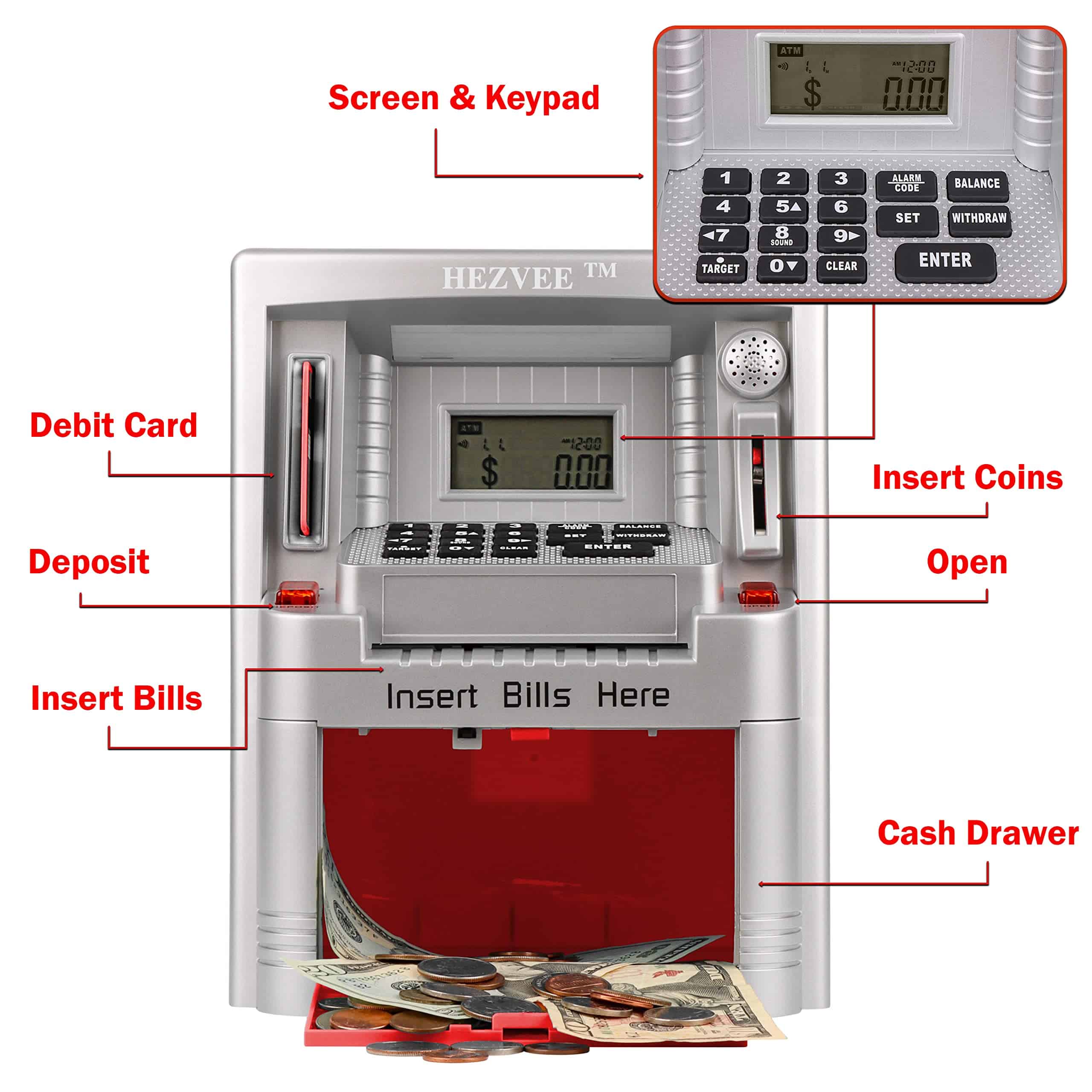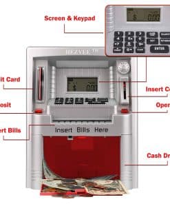 4. ALCANCÍA ATM PARA DINERO REAL: Con una interfaz de máquina ATM, los niños pueden aprender a depositar y retirar dinero real como en un banco real. Da el saldo después de cada transacción de depósito o retiro. También, averigua el saldo total presionando la tecla de saldo. Los niños pueden depositar cualquier moneda (centavo, níquel, diez centavos o un cuarto) y cualquier billete (un dólar, cinco dólares, diez dólares, veinte dólares, cincuenta dólares o cien dólares). Esta alcancía digital guarda dinero hasta 9999.99.