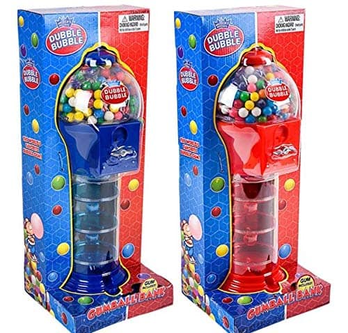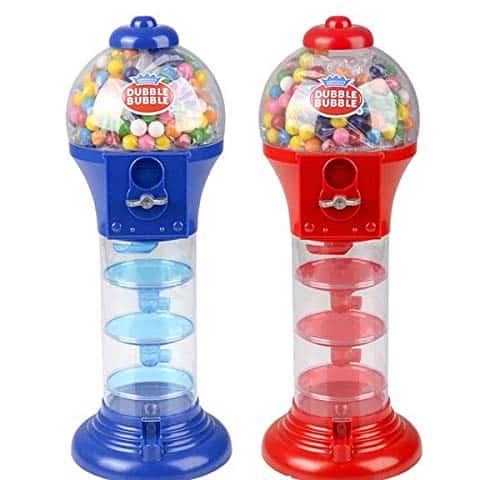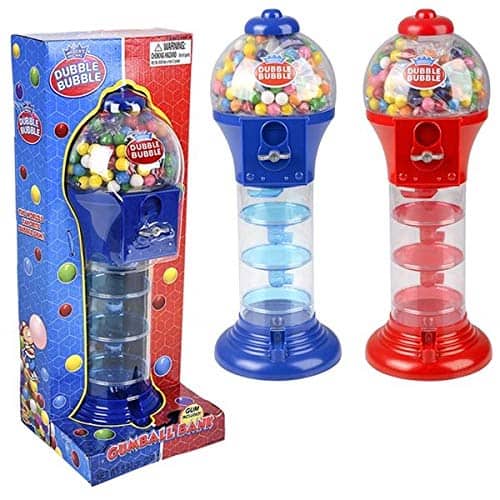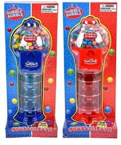 Máquina de gumball de diversión en espiral. Vendido en caja impresa. No es operado con monedas. Mide 18″ de altura. Variedad de rojo y azul. No se puede elegir el color. Perilla de liberación de metal. Ideal para premios. Chicle incluido. Vendido por pieza. Para edades de 3+.