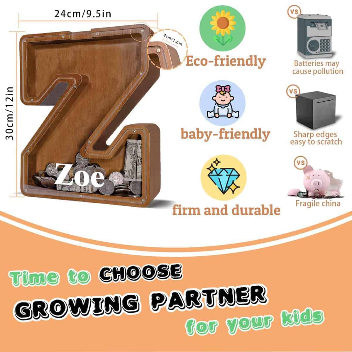 1. ¡SEGURIDAD Y RESISTENCIA: Cada alcancía grande de letra de madera está elaborada a la perfección por una máquina CNC con una madera de alta calidad, ecológica y sostenible para un atractivo natural y duradero, durabilidad y uso duradero. La alcancía de letra personalizada ha sido meticulosamente pulida con diez vueltas de máquina y dos vueltas manuales para crear un tacto suave y delicado. Tratada con aceite mineral de grado alimenticio y cera de abejas, no se utilizan pinturas ni tintes, ¡Es 100% seguro, libre de toxinas y sin formaldehído!