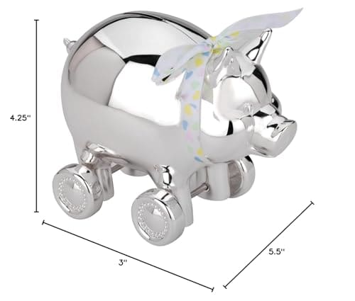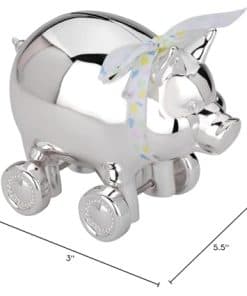Esta alcancía está hecha de plateado en plata y tiene la forma clásica de un cochinito. Seguro que encantará a los pequeños listos para ahorrar, la alcancía también incluye ruedas que giran y un delicado lazo decorativo.
