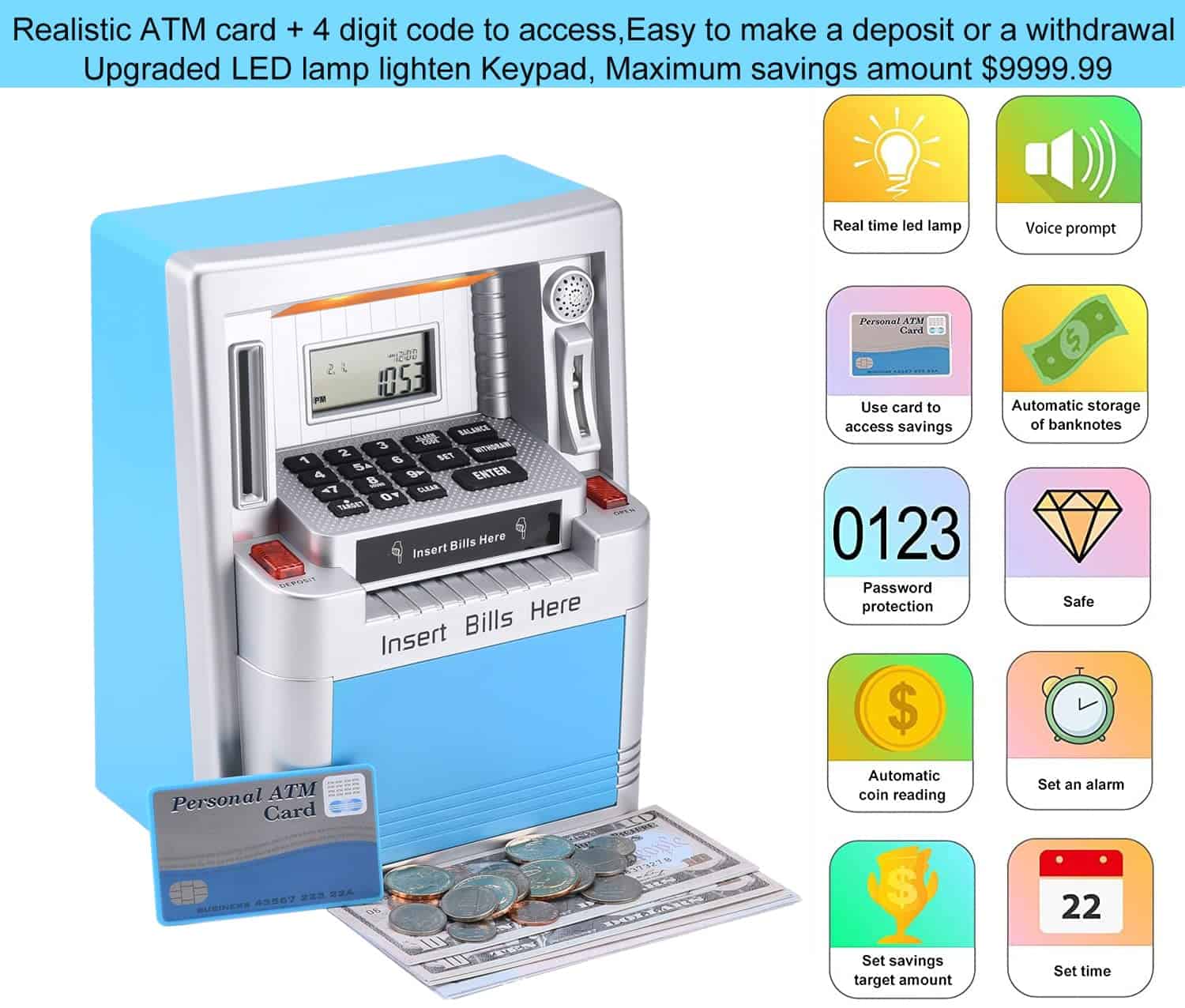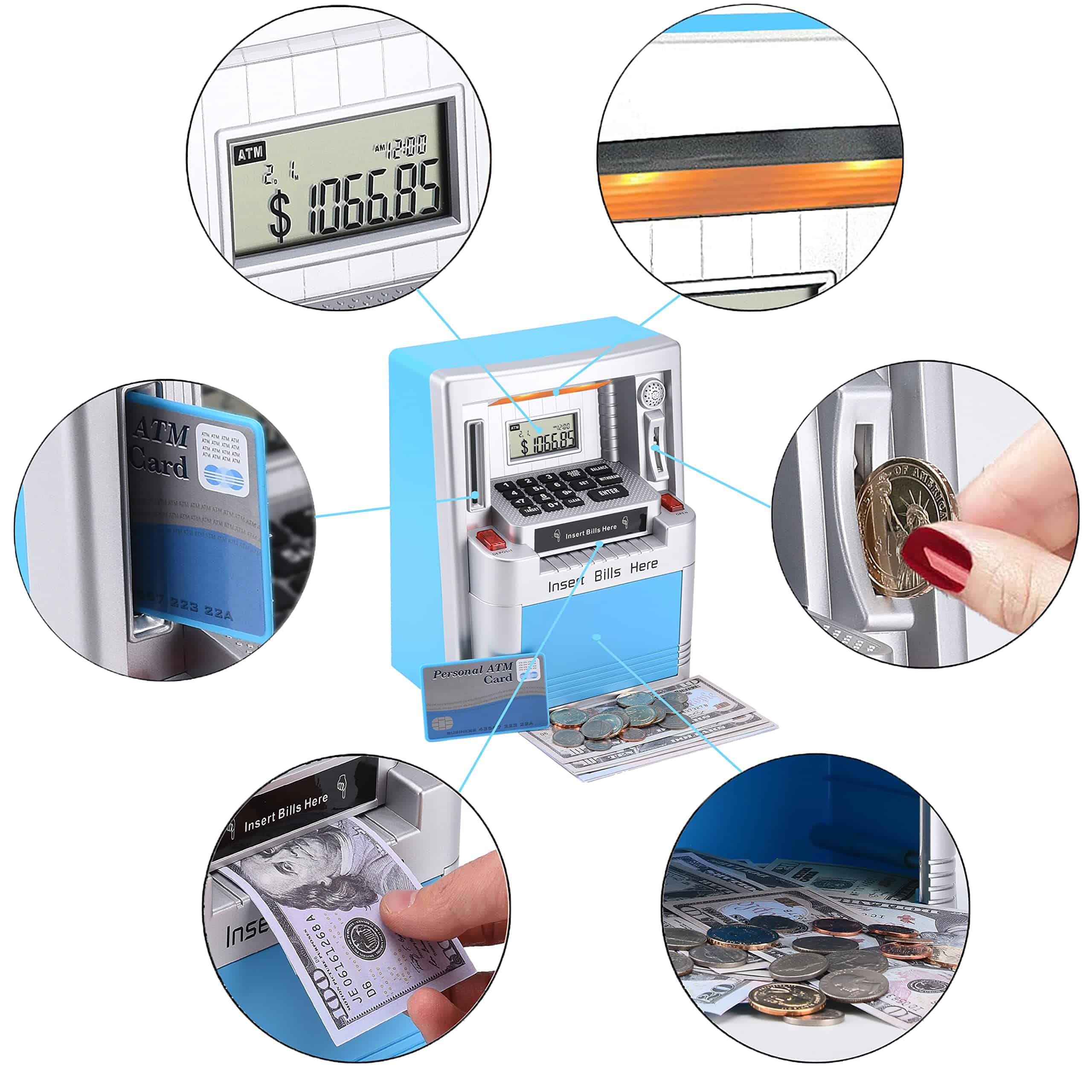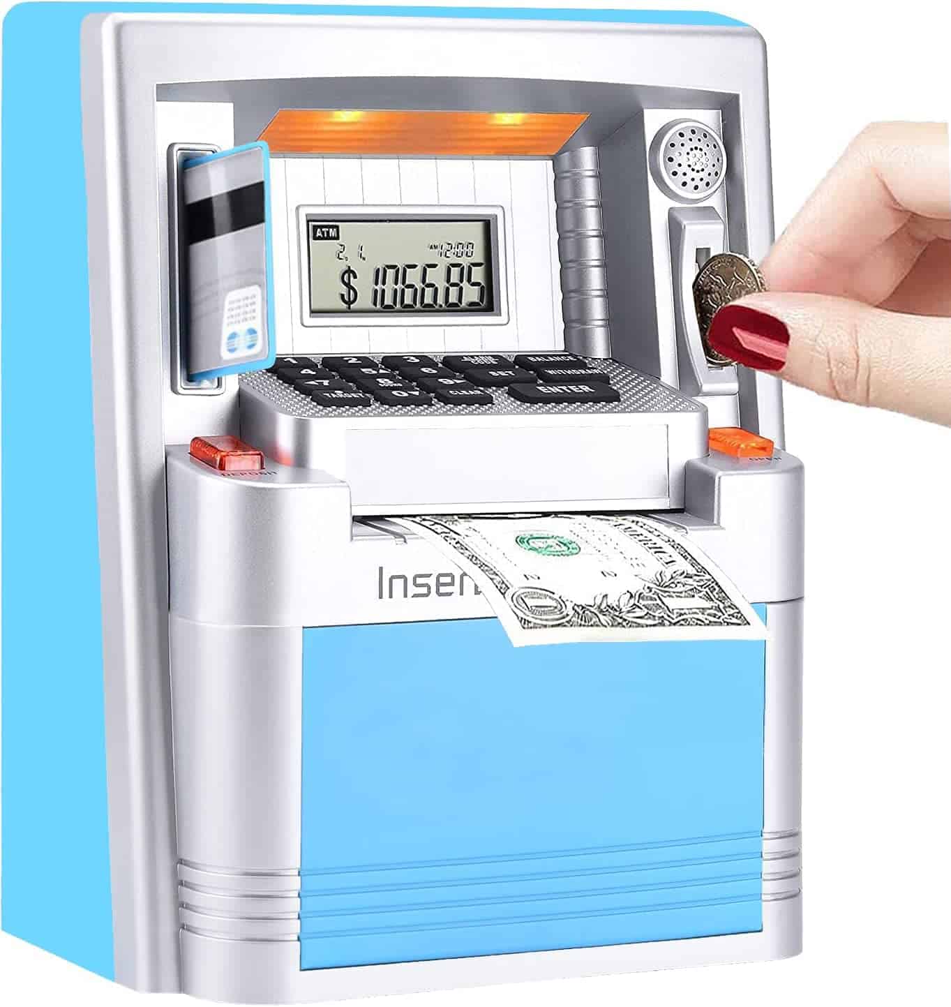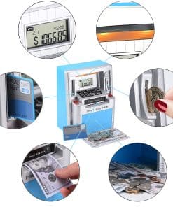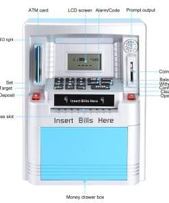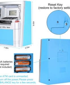 Ama a tus hijos enseñándoles a ahorrar, Administra su dinero de bolsillo con esta nueva y mejorada máquina de ATM verdadera para la vida real. Detalles del producto: Peso de envío del artículo: 1022g, Dimensiones del producto: 7.5×4.3×9.5 pulgadas, Material: ABS y componentes electrónicos, Tipo de fuente de alimentación: 3 pilas AA (no incluidas). Características del producto: Haz que ahorrar dinero sea divertido para los niños con la alcancía digital ATM. Enseña a los niños la importancia del ahorro con esta caja de dinero falsa. Esta alcancía/banco de monedas ATM personal con pantalla digital es el complemento perfecto para que tus hijos comiencen a aprender sobre el ahorro bancario. Los niños incluso pueden establecer metas de ahorro y verificar la pantalla para ver cuántos días o dinero faltan para alcanzar sus objetivos. La alarma interna sonará si alguna mano pegajosa intenta robar los ahorros de tu máquina personal de alcancía de monedas. La ranura para monedas reconoce la denominación de cada moneda, lo que ayuda a llevar un registro de los saldos de la cuenta y del progreso de los ahorros. También se pueden depositar y retirar billetes y el teclado se puede usar para actualizar la cantidad correspondiente a tu nuevo saldo. Este banco tiene funciones incorporadas como hora, reloj de 24 horas, fecha, alarma, calculadora, sonidos y tonos ATM para una experiencia realista. ¡Enseña a los niños a ahorrar dinero y hacer un seguimiento del progreso de sus ahorros! Cuenta con una alarma con reloj en tiempo real con calendario. Administra tu dinero con este ATM personal que solo se activa con la tarjeta proporcionada y el código personal de 4 dígitos. Acepta y reconoce cada moneda insertada y también acepta billetes al dibujarlos a través de la ranura en la parte delantera de la máquina. Incluye: Alcancía ATM, Tarjeta ATM para operar el ATM y manual de instrucciones. Se requieren 3 pilas AA (no incluidas).