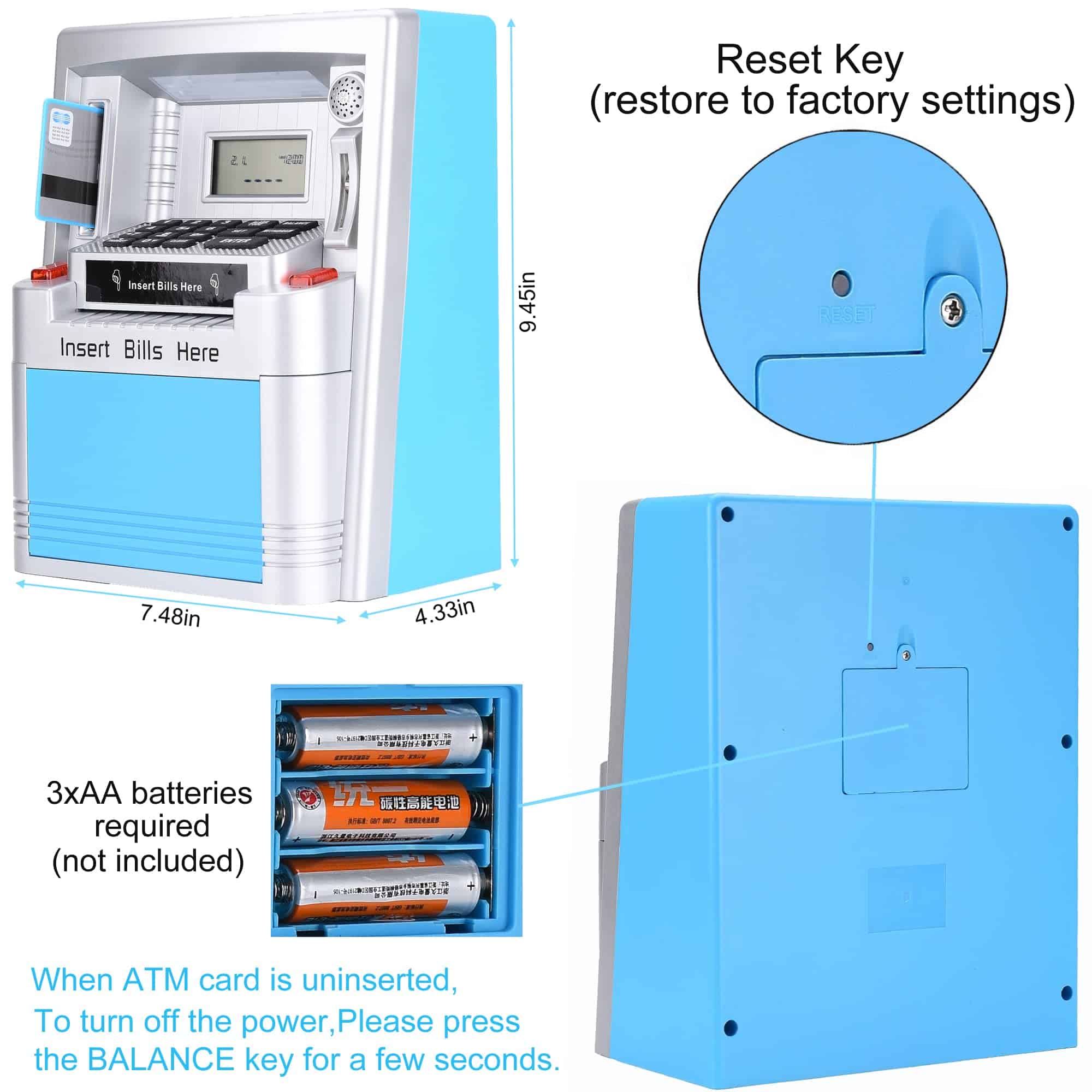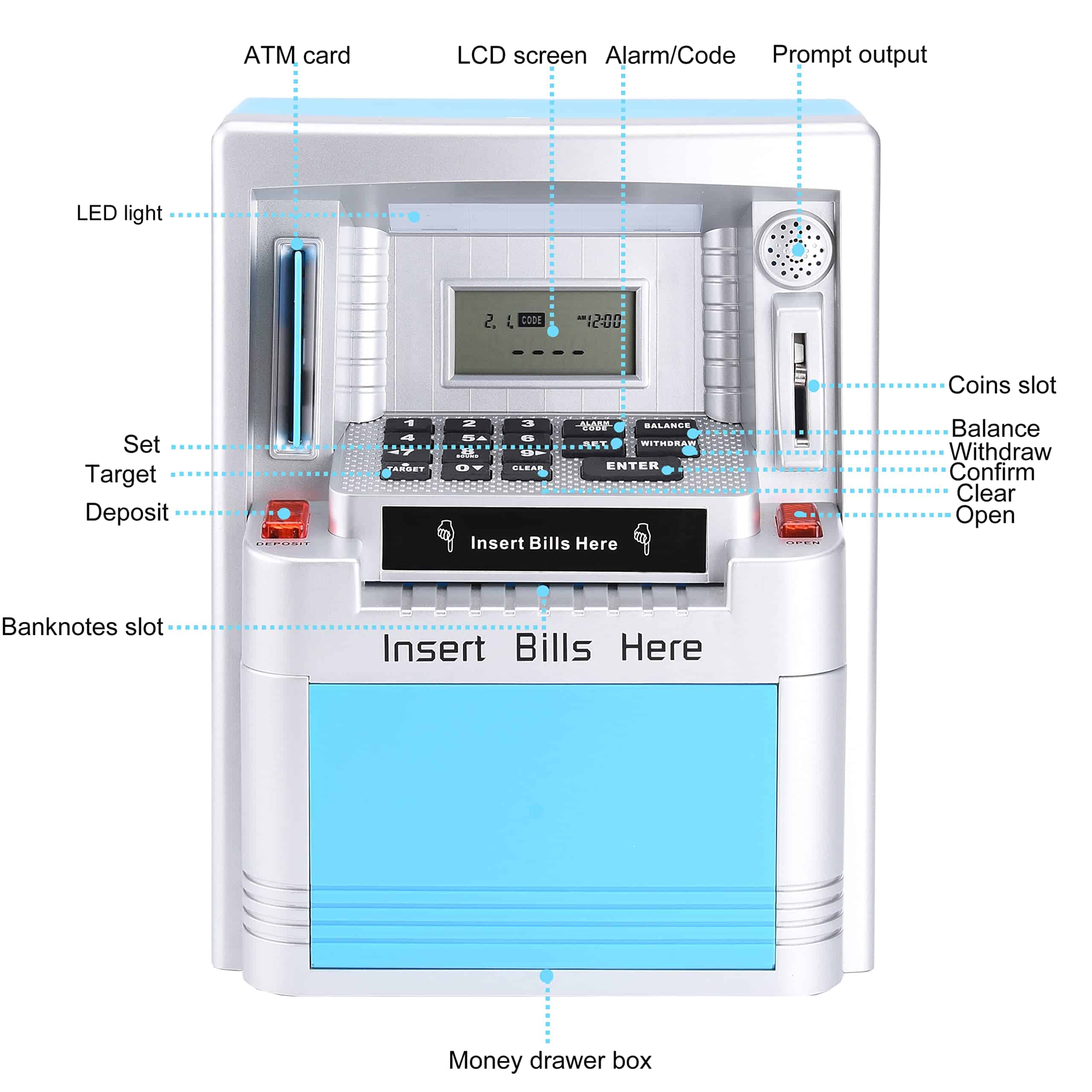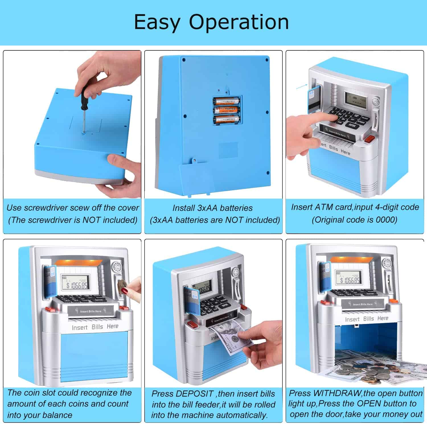 Ama a tus hijos enseñándoles a ahorrar, Administra su dinero de bolsillo con esta nueva y mejorada máquina de ATM verdadera para la vida real. Detalles del producto: Peso de envío del artículo: 1022g, Dimensiones del producto: 7.5×4.3×9.5 pulgadas, Material: ABS y componentes electrónicos, Tipo de fuente de alimentación: 3 pilas AA (no incluidas). Características del producto: Haz que ahorrar dinero sea divertido para los niños con la alcancía digital ATM. Enseña a los niños la importancia del ahorro con esta caja de dinero falsa. Esta alcancía/banco de monedas ATM personal con pantalla digital es el complemento perfecto para que tus hijos comiencen a aprender sobre el ahorro bancario. Los niños incluso pueden establecer metas de ahorro y verificar la pantalla para ver cuántos días o dinero faltan para alcanzar sus objetivos. La alarma interna sonará si alguna mano pegajosa intenta robar los ahorros de tu máquina personal de alcancía de monedas. La ranura para monedas reconoce la denominación de cada moneda, lo que ayuda a llevar un registro de los saldos de la cuenta y del progreso de los ahorros. También se pueden depositar y retirar billetes y el teclado se puede usar para actualizar la cantidad correspondiente a tu nuevo saldo. Este banco tiene funciones incorporadas como hora, reloj de 24 horas, fecha, alarma, calculadora, sonidos y tonos ATM para una experiencia realista. ¡Enseña a los niños a ahorrar dinero y hacer un seguimiento del progreso de sus ahorros! Cuenta con una alarma con reloj en tiempo real con calendario. Administra tu dinero con este ATM personal que solo se activa con la tarjeta proporcionada y el código personal de 4 dígitos. Acepta y reconoce cada moneda insertada y también acepta billetes al dibujarlos a través de la ranura en la parte delantera de la máquina. Incluye: Alcancía ATM, Tarjeta ATM para operar el ATM y manual de instrucciones. Se requieren 3 pilas AA (no incluidas).