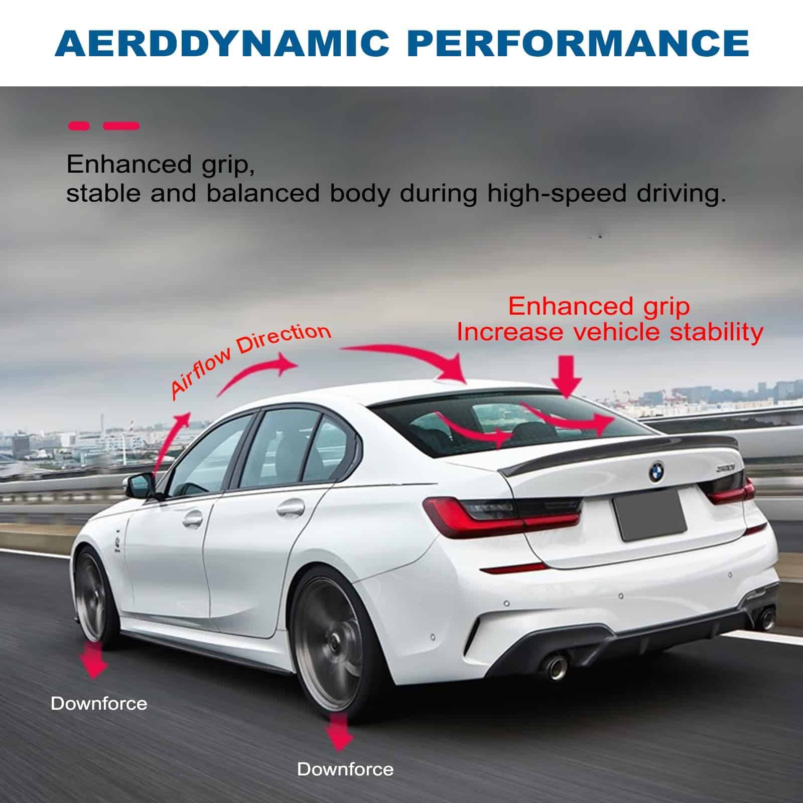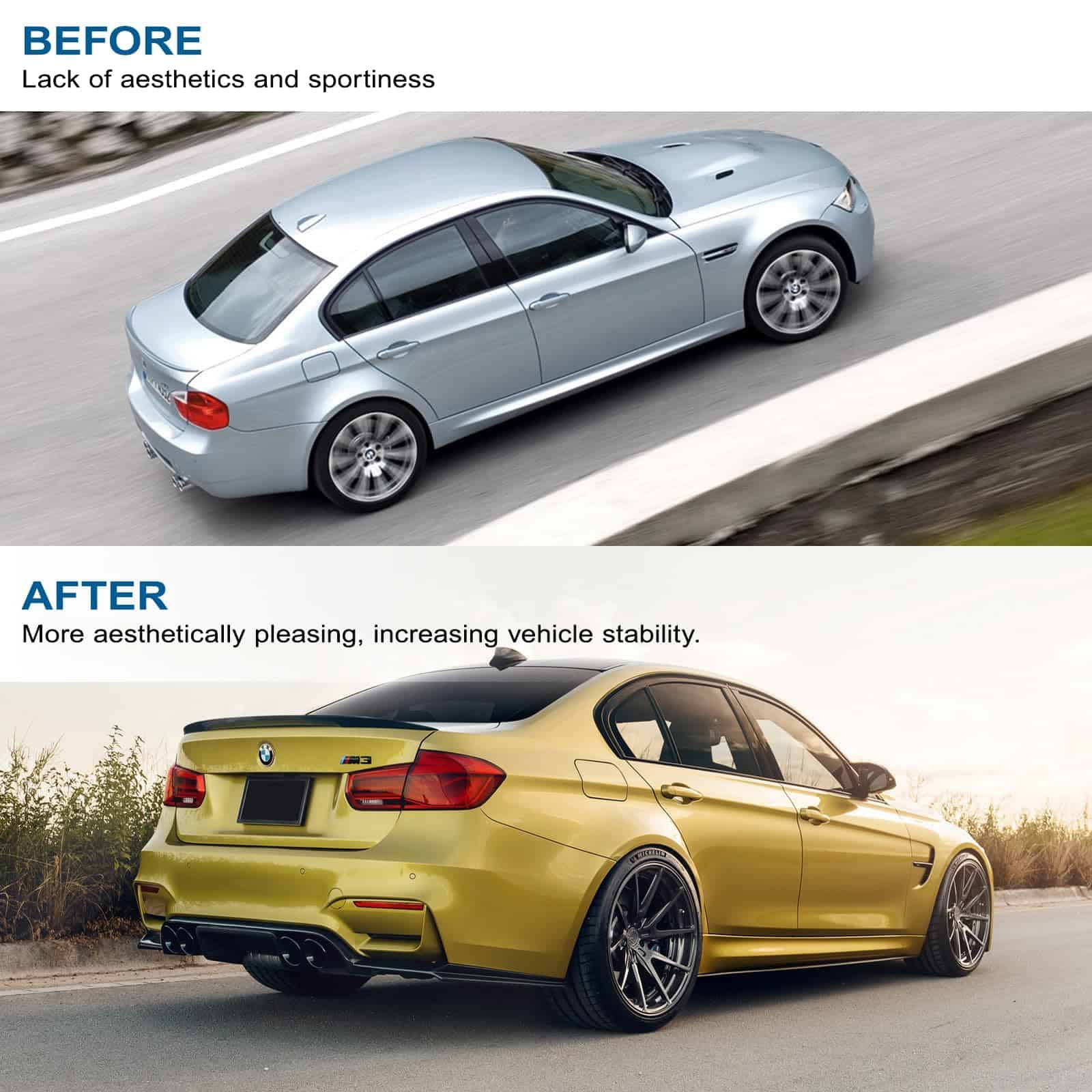 Inspirado en el diseño de alto rendimiento del M4, este alerón de maletero ofrece una apariencia elegante y agresiva que mejora drásticamente la parte trasera de tu sedán. Es la combinación perfecta de deportividad y refinamiento. Fabricado en plástico ABS ligero pero resistente, este alerón está construido para resistir la conducción diaria y las duras condiciones climáticas. El recubrimiento resistente a los rayos UV evita la decoloración, agrietamiento y desgaste con el tiempo. Viene con cinta de doble cara de grado automotriz preinstalada para una instalación rápida y sin herramientas. No requiere taladrar ni cortar, solo limpia la superficie, pela y presiona para una mejora instantánea del exterior que se mantiene seguro a altas velocidades. Este alerón trasero no solo mejora la apariencia, sino que también mejora la aerodinámica al reducir la resistencia y añadir fuerza descendente en la parte trasera a velocidades más altas, mejorando tanto el rendimiento como la eficiencia de combustible mientras le da a tu coche un acabado inspirado en las carreras.