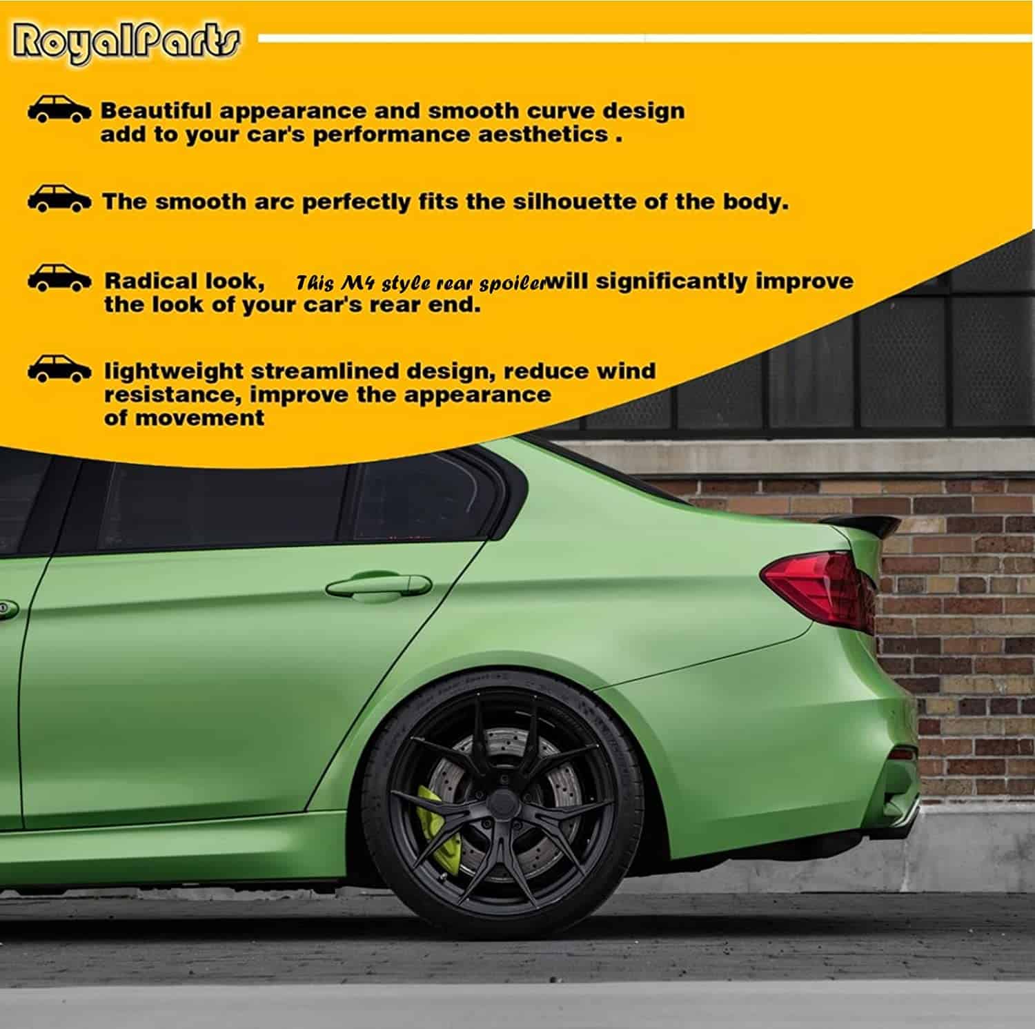2. Estilo M4: Mejorará drásticamente la apariencia deportiva de su coche. El nuevo alerón funciona bien y mejora el rendimiento general en manejo y durabilidad. Añade más downforce y ayuda en la aerodinámica.