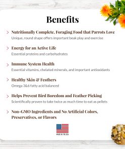 Alimento para aves LAFEBER’S Classic Nutri-Berries es una opción premium para guacamayos y cacatúas. Formulado por veterinarios aviares y nutricionistas aviares, este alimento ofrece nutrición completa con el doble de forrajeo de los pellets tradicionales. La forma redonda de Nutri-Berrie proporciona un juego y ejercicio importante para el pico, lo que ayuda a prevenir el aburrimiento de las aves y el picoteo de las plumas. Hecho con ingredientes no transgénicos y de grado humano, sin colores artificiales, sabores o conservantes añadidos. Rica en antioxidantes y equilibrada en Omega 3 y 6, esta fórmula ayuda a mantener la piel, las plumas y el sistema inmunológico de las aves saludables. Con una garantía de satisfacción del 100%, puedes confiar en la calidad y el compromiso de LAFEBER’S con la salud y felicidad de tus aves mascotas