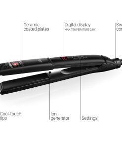 Lleva el cabello a la forma deseada con el alisador de cabello profesional 6.0 de Valera. Es ideal para alisar y rizar de forma profesional. El paquete incluye una tapa de silicona aislante del calor para almacenar el alisador después de usarlo. Gracias a su revestimiento de cerámica con turmalina y su generador de iones, SleekPro 6.0 ayuda a obtener un cabello más brillante y sedoso. También incluye un sistema de placas flotantes para un contacto uniforme con el cabello. El ionizador integrado hace que el cabello luzca brillante sin carga electrostática. Gracias a su tecnología Color Care, Sleekpro 6.0 también es ideal para cabello teñido. Además, cuenta con un acabado de tacto suave y está equipado con puntas frías, un consejero de calor, una función de apagado automático después de 60 min y un cable giratorio de 10 pies, para un uso cómodo y seguro. Este alisador incluye una función de memoria y un sistema de regulación de temperatura digital, para un control total de la temperatura de hasta 230ºC.