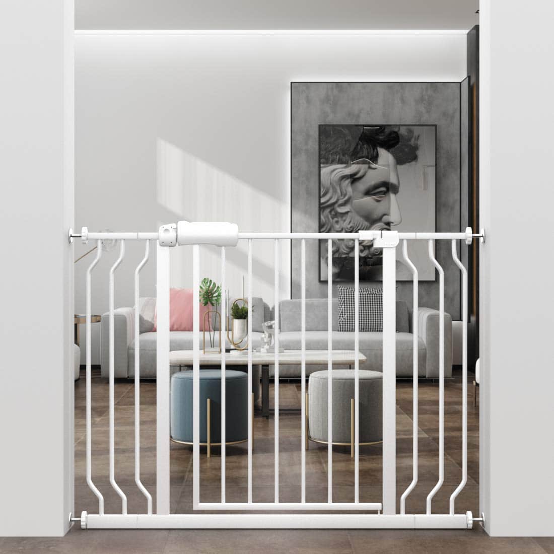 Puerta de bebé resistente y segura para caminar con 4 pernos de ajuste a presión para escaleras/puertas, instalación fácil de paso a través con una sola mano, sin herramientas requeridas, para bebés/perros/gatos. La altura de la puerta estrecha ajustada por tensión es de 30.7″ hecha para niños de 6 a 36 meses, también puede ser utilizada para perros pequeños, medianos y grandes. ¡Agregando seguridad para su bebé o mascota! Característica del producto: No necesita taladrar, fácil de instalar. Puertas interiores de cierre automático. Abierto desde ambos lados, nunca confuso y de fácil uso. Componentes de la caja: 1 puerta de bebé estrecha + 4 pernos ajustables + Manual de instalación. Atención: 1. No corte el lazo que sujeta la puerta al portón antes de instalarlo, es importante. 2. Hay un espacio antes de instalarlo, esto no es defectuoso o doblado. Si descubre que después de apretar los pernos todavía hay un gran espacio, por favor continúe apretando los dos pernos superiores hasta que acorte el espacio. 3. Deje una distancia para el espacio, normalmente necesita dejar alrededor de 0.4» para el espacio, de lo contrario estará demasiado apretado y no podrá abrir la puerta. 4. Si no puede abrir la puerta, afloje los dos pernos superiores. 5. Cuando se use en escaleras cilíndricas, se necesita comprar un perno en forma de U, el perno en forma de U no está incluido en nuestra caja. 6. Este producto no necesariamente evitará todos los accidentes, por favor nunca deje a un niño sin supervisión.