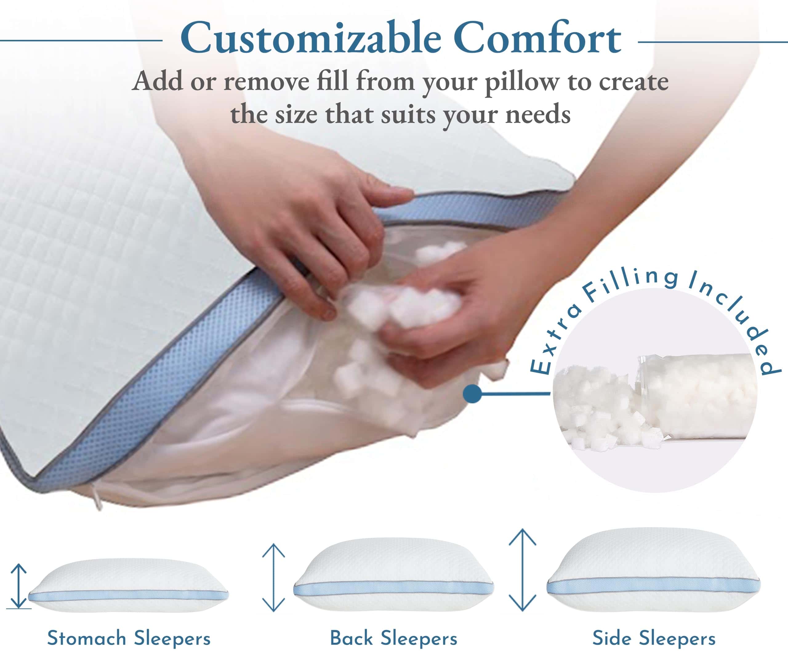 1. Altura y Sensación Ajustables: Personalice su cómodo sueño con nuestras almohadas tamaño king ajustables de 1 pieza (18″ W x 36″ L). El núcleo interno con cremallera de piezas de espuma viscoelástica permite una fácil personalización para su altura y firmeza preferidas. Simplemente use el relleno adicional que viene con el producto. No hay trozos de espuma aquí, solo cubos diseñados para una comodidad total.