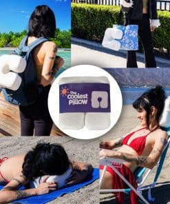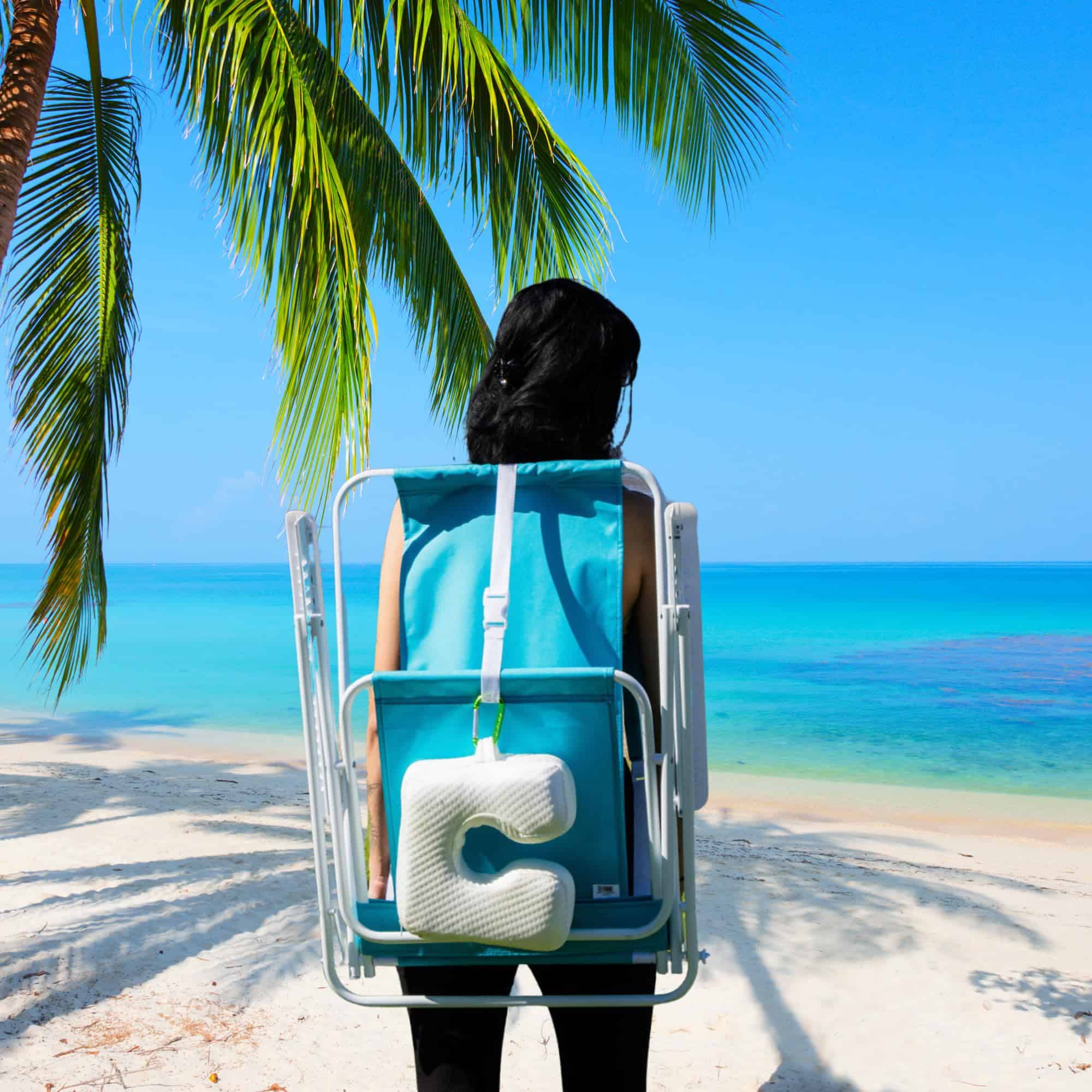 La Almohada Coolest viaja fácilmente usando una correa incorporada para engancharla a la correa de tu bolso de playa con un mosquetón, para que no ocupe espacio cuando la guardes: tus toallas, pareos, sandalias, refrigerios, aceites bronceadores y lociones se quedarán en el bolso mientras La Almohada Coolest viaja contigo.