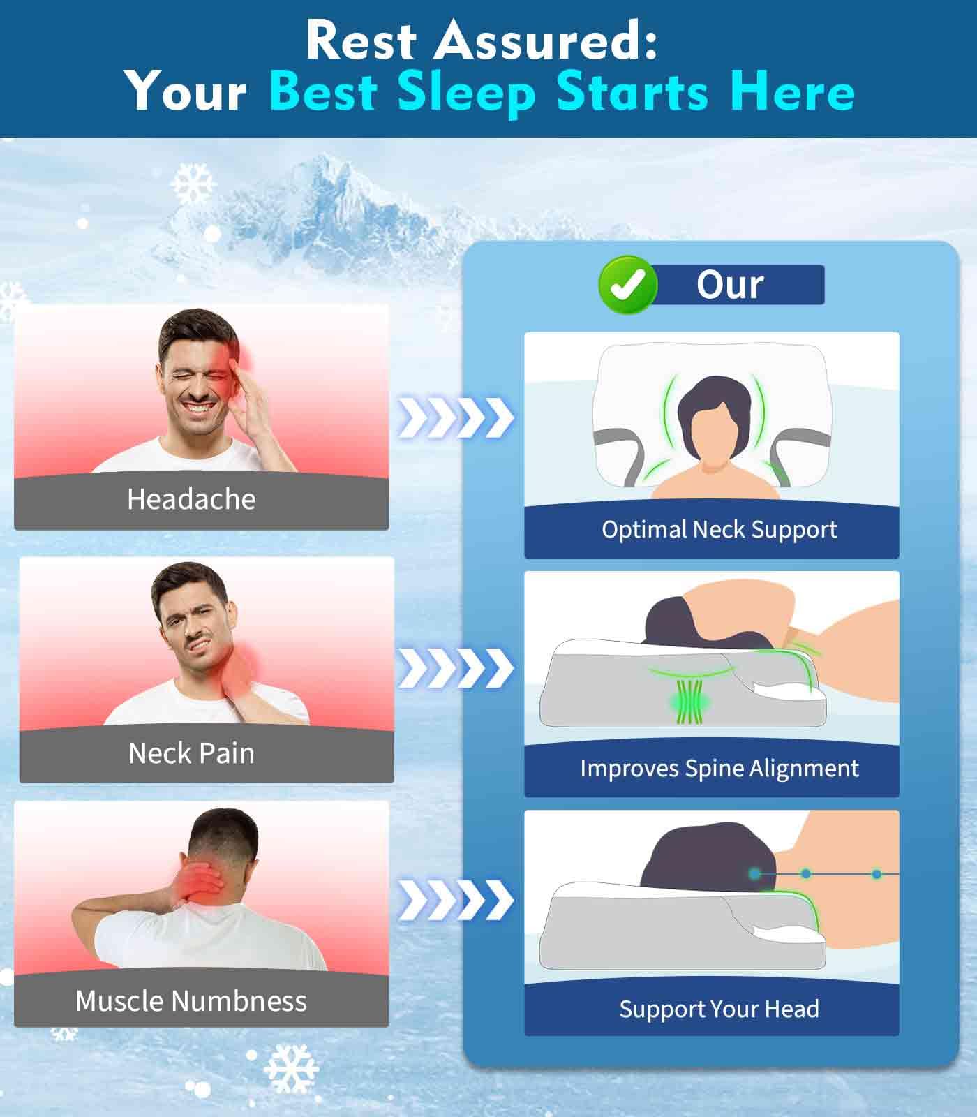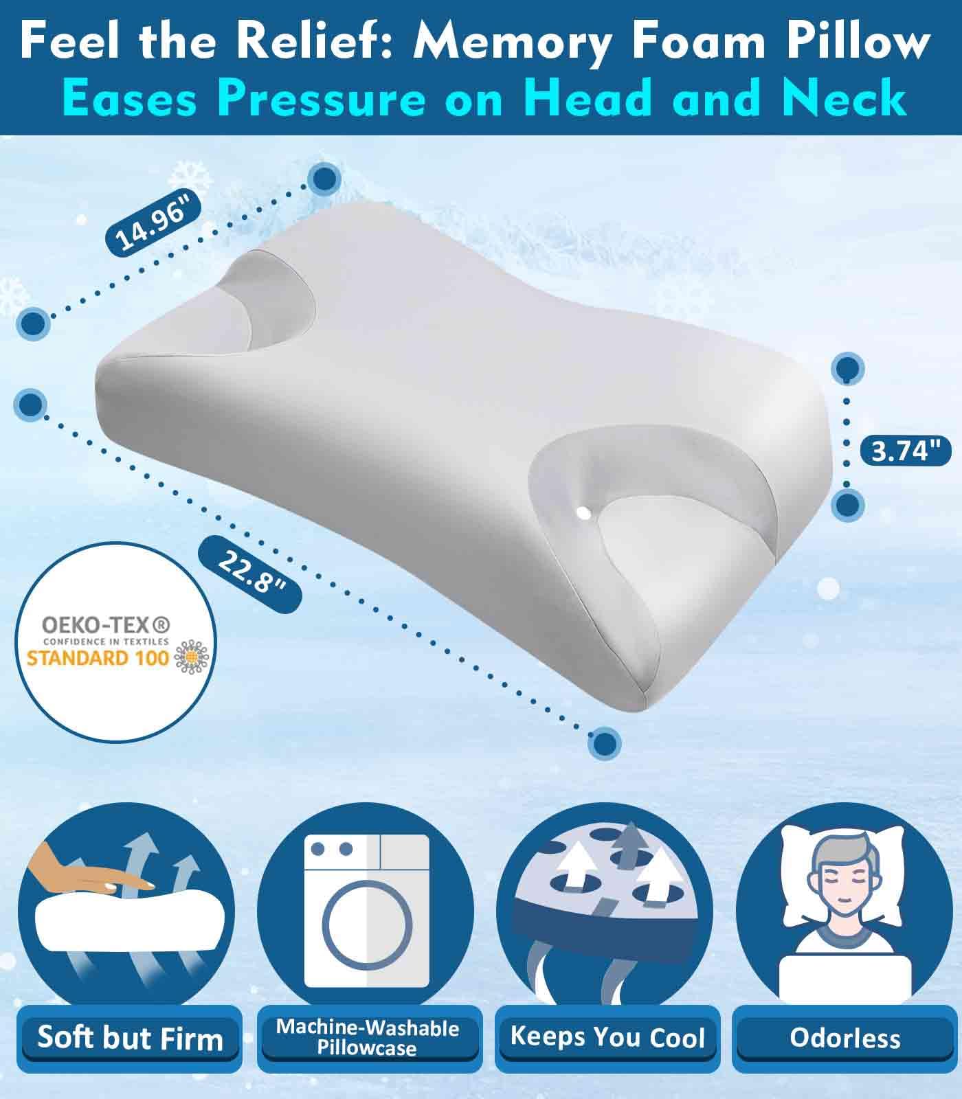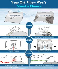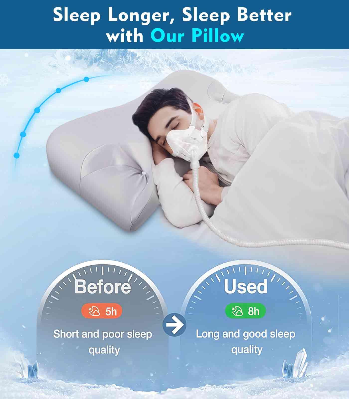 Crafted for Superior Comfort and Support for All CPAP Users This CPAP pillow delivers outstanding comfort and support for side, back, and stomach sleepers alike. Designed to cradle the neck and reduce pain, it promotes uninterrupted sleep all night. Ideal for CPAP users, it helps maintain mask seal integrity, allowing for comfortable side-sleeping without air leaks – a true game-changer for restful sleep. Ultimate Comfort with Slow Rebound Memory Foam This cervical pillow is crafted with premium slow-rebound memory foam that gently adapts to the shape of your head and neck for a truly cloud-like experience. As you lie down, the foam slowly rebounds, providing just the right amount of firmness to ensure optimal alignment, allowing you to enjoy a restful and rejuvenating night’s sleep. Cooling Breathable & Removable Pillowcase This side sleeper pillow is equipped with a cooling pillowcase. The soft, breathable cover is cool to the touch and glides smoothly against your skin, helping to prevent skin creases and hair frizz. With a convenient side zipper, the pillowcase is easy to remove and machine washable for effortless cleaning. The Perfect Gift for Your Spouse: Help your loved one sleep comfortably with their BIPAP, APAP, or CPAP. Give the gift of restful nights and easy breathing. Designed to work seamlessly with nasal, full-face, or any type of mask, it’s a thoughtful way to show you care. Buy with Confidence: If this face pillow doesn’t reduce air leaks, relieve mask pressure, or improve your sleep quality, simply reach out to our. Enjoy peace of mind with our hassle-free 30-day return policy.
