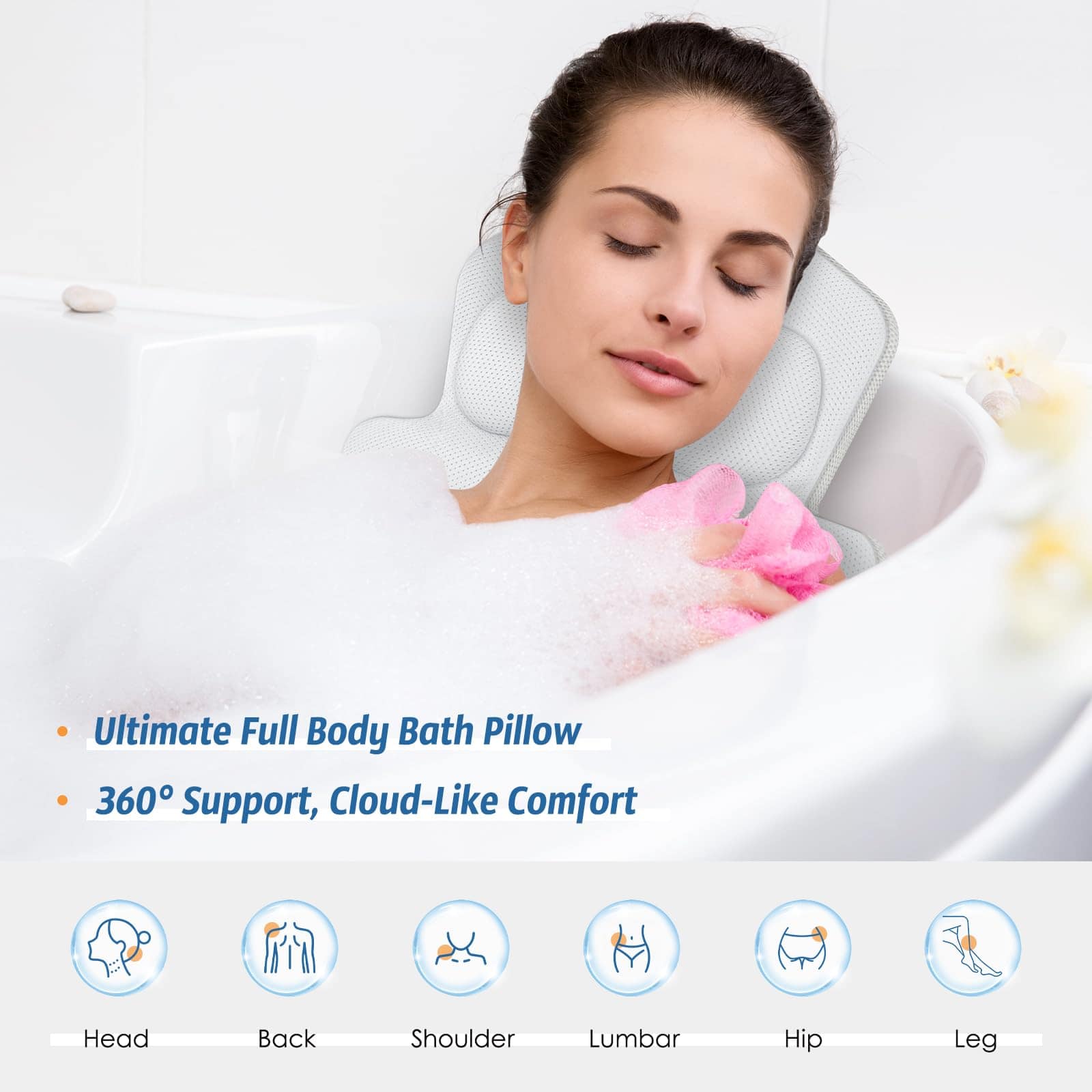 3. : Nuestra lujosa almohada de baño de cuerpo completo incluye un suave cojín ajustable que mejora la comodidad y proporciona un soporte firme para su cintura. El cojín desmontable también se puede reposicionar para acunar suavemente sus piernas o pies, adaptándose a su postura de baño preferida.