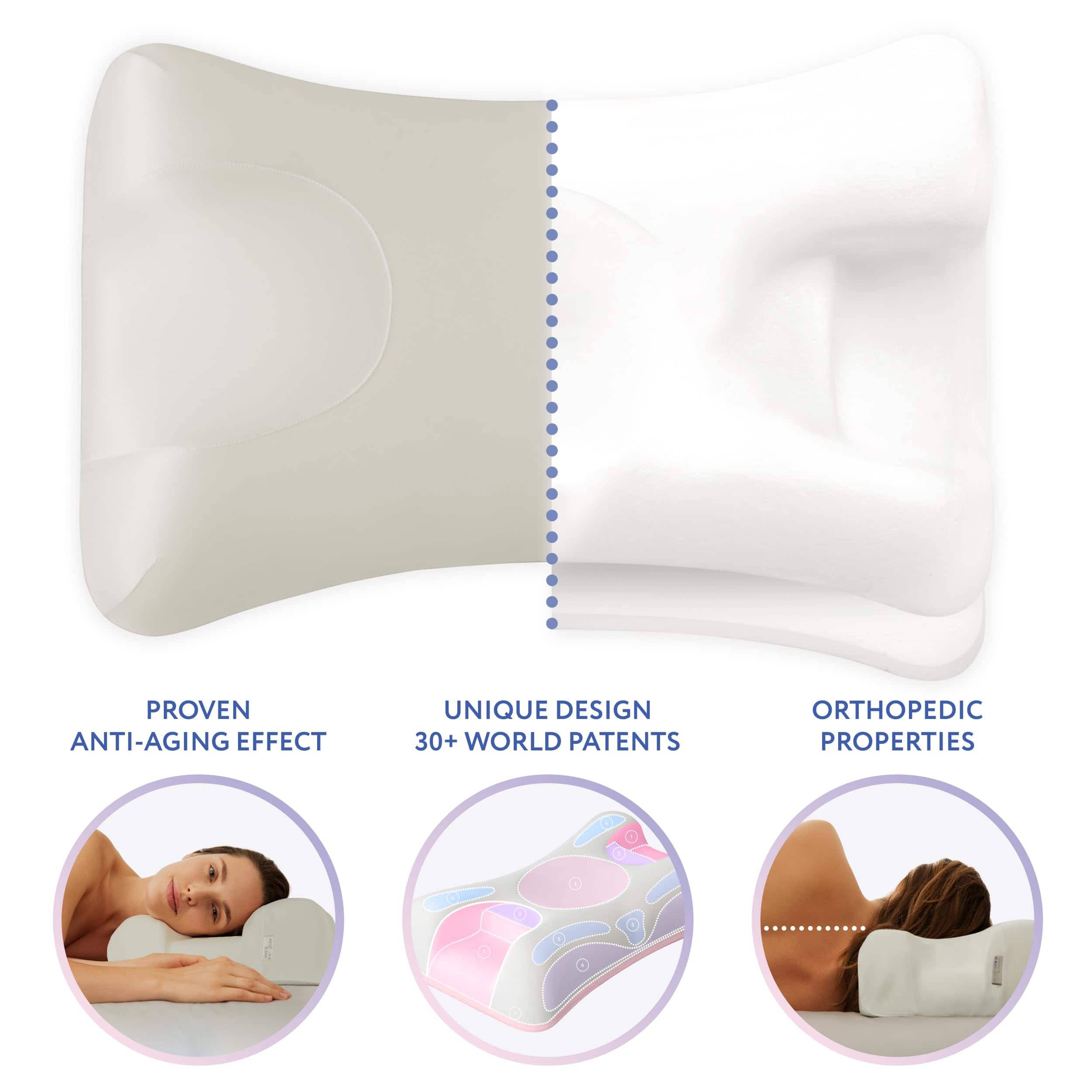 2. EFECTO ORTOPÉDICO La almohada fue diseñada junto con especialistas ortopédicos. La construcción tiene un diseño ergonómico perfecto, que apoya suavemente tu cabeza y cuello en la posición más anatómicamente correcta mientras duermes. Tu columna y músculos se relajarán.