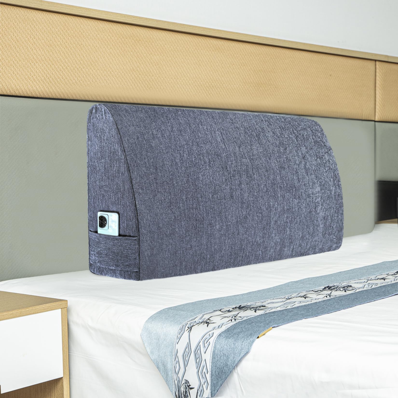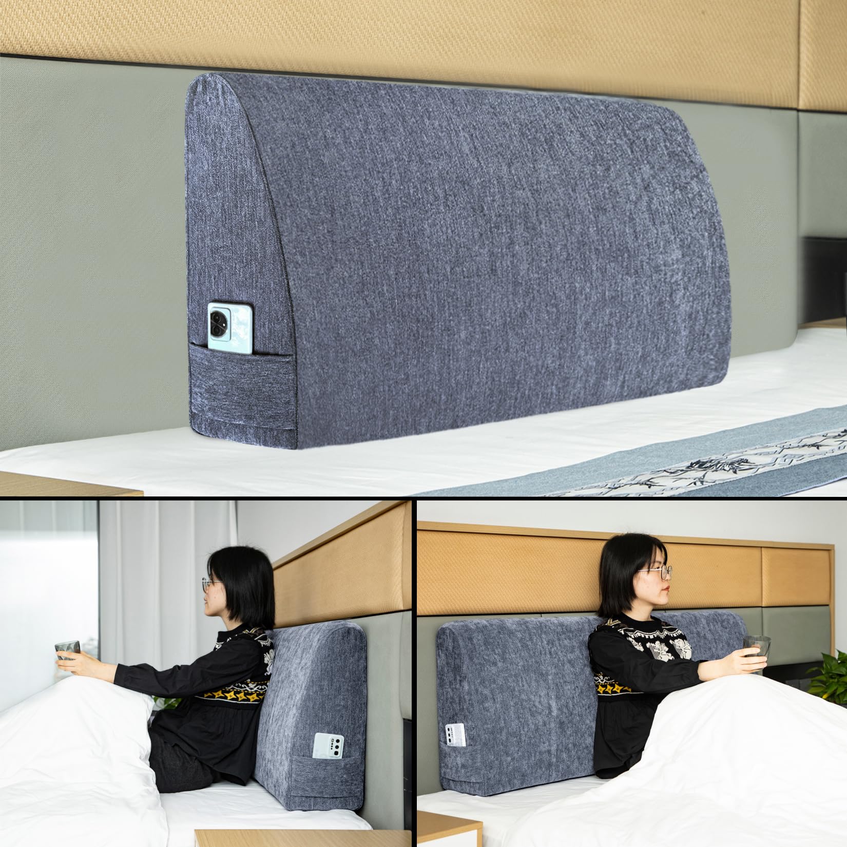 4. Diseño: La almohada de cuña para cabecero adopta un diseño de arco con una base ancha y una parte superior estrecha, y obtendrás un excelente apoyo al apoyarte en ella en cualquier postura. Y llena el espacio entre el cabecero y el colchón. Se han añadido pequeñas bolsas de almacenamiento en ambos lados de la almohada de cabecero para guardar fácilmente algunos objetos pequeños.