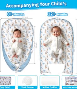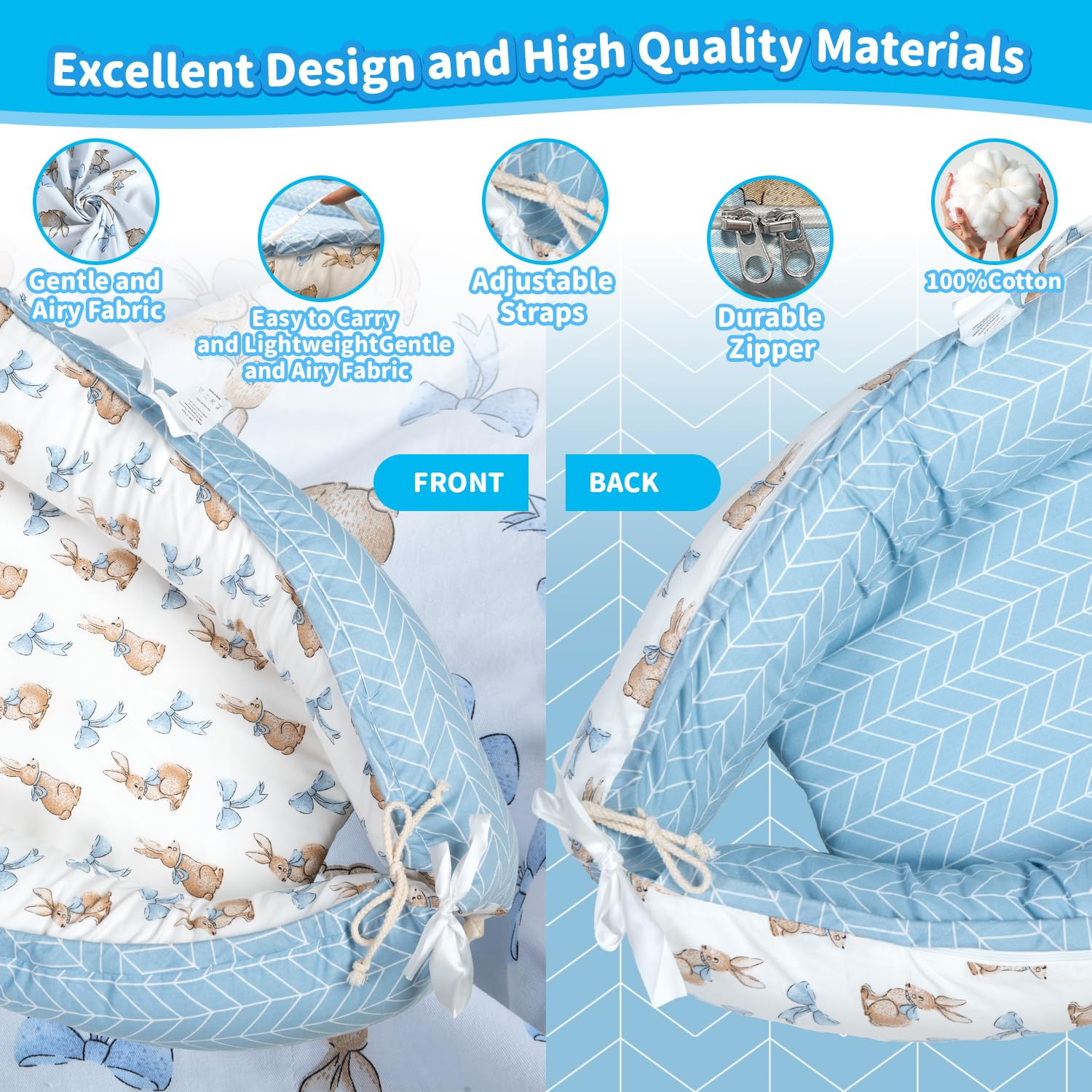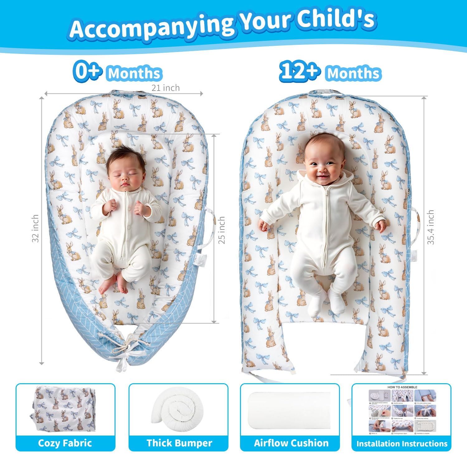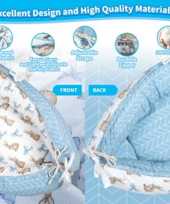 Nuestra almohada de descanso para bebés puede proporcionar el máximo confort para bebés de 0 a 24 meses. Está fabricada en algodón 100% ultra suave y equipada con un grueso protector, ofreciendo una protección de 360 grados y una sensación tan acogedora como el útero. Con un diseño biónico avanzado, puede soportar los cuellos y las espaldas de los bebés. La combinación de cojines y protectores crea un entorno seguro y cómodo. Viene con cuerdas elásticas ajustables y una cremallera oculta, que te permiten ajustar fácilmente su tamaño a medida que tu bebé crece. Tiene un diseño de doble cara con diferentes patrones, y ambos lados son lavables a máquina para un mantenimiento sencillo. Con un peso de solo 3.3 libras (1.5 kg) y asas de transporte convenientes, es perfecta para viajar. Además, ha sido certificada para cumplir con las normas CPC, ASTM y CPSIA.