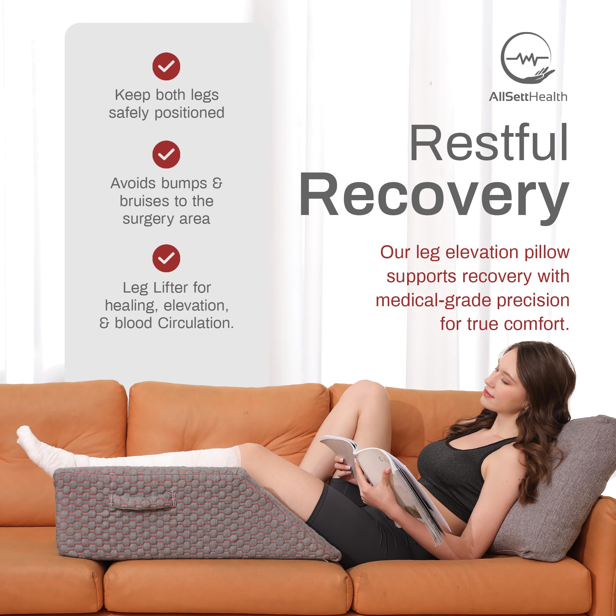 1. Soporte mejorado de almohada de elevación de pierna: Nuestra almohada de elevación de pierna está aquí para proporcionar un excelente apoyo y una posición cómoda para aquellos que se están recuperando de una cirugía de pierna y necesitan una cuña para la pierna o que desean disfrutar de un descanso y sueño más profundos. 2. Surco en forma de U contorneado: Estas almohadas de elevación de pierna para la hinchazón cuentan con un surco único en forma de U que se moldea a la forma de la pierna. Esto garantiza una posición segura y cómoda para una mayor protección y también evita cualquier molestia durante el uso. La almohada perfecta para elevar la pierna después de la cirugía de rodilla. 3. Espuma viscoelástica gruesa con funda suave lavable: Fabricadas con excelente espuma viscoelástica, estas ayudas para la recuperación de reemplazo de rodilla ofrecen una excelente combinación de soporte y comodidad. La espuma se adapta a la forma de la pierna, proporcionando alivio de la presión y ayudando a mejorar la postura. La almohada cuenta con una funda extraíble y lavable a máquina que no solo es cómoda, sino que también está diseñada para proteger, gracias a su funda de jacquard de felpa, añadiendo una capa adicional de acolchado al producto. 4. Almohadas ergonómicas en cuña para después de la cirugía: Nuestras almohadas de elevación de doble pierna para después de la cirugía están diseñadas pensando en su bienestar. Con medidas de 29 x 13 x 9.5 pulgadas, esta almohada ofrece un amplio espacio para sus piernas, garantizando una posición cómoda y segura. Proporciona una superficie amplia y estable para ambos pies, promueve el flujo sanguíneo y reduce la hinchazón y el malestar. La almohada para el pie es un imprescindible para la recuperación del ligamento cruzado anterior, así como para personas que sufren de afecciones de circulación sanguínea. 5. Diseño multi-asas y antideslizante: Dos asas en los lados de las almohadas de pierna para dormir facilitan la posición de su cuerpo al acostarse, estas asas también pueden usarse para transportar la almohada, haciéndola portátil y conveniente. La parte inferior de la funda de la almohada está diseñada con partículas de silicona antideslizantes para evitar que la almohada de pierna se mueva durante el uso.