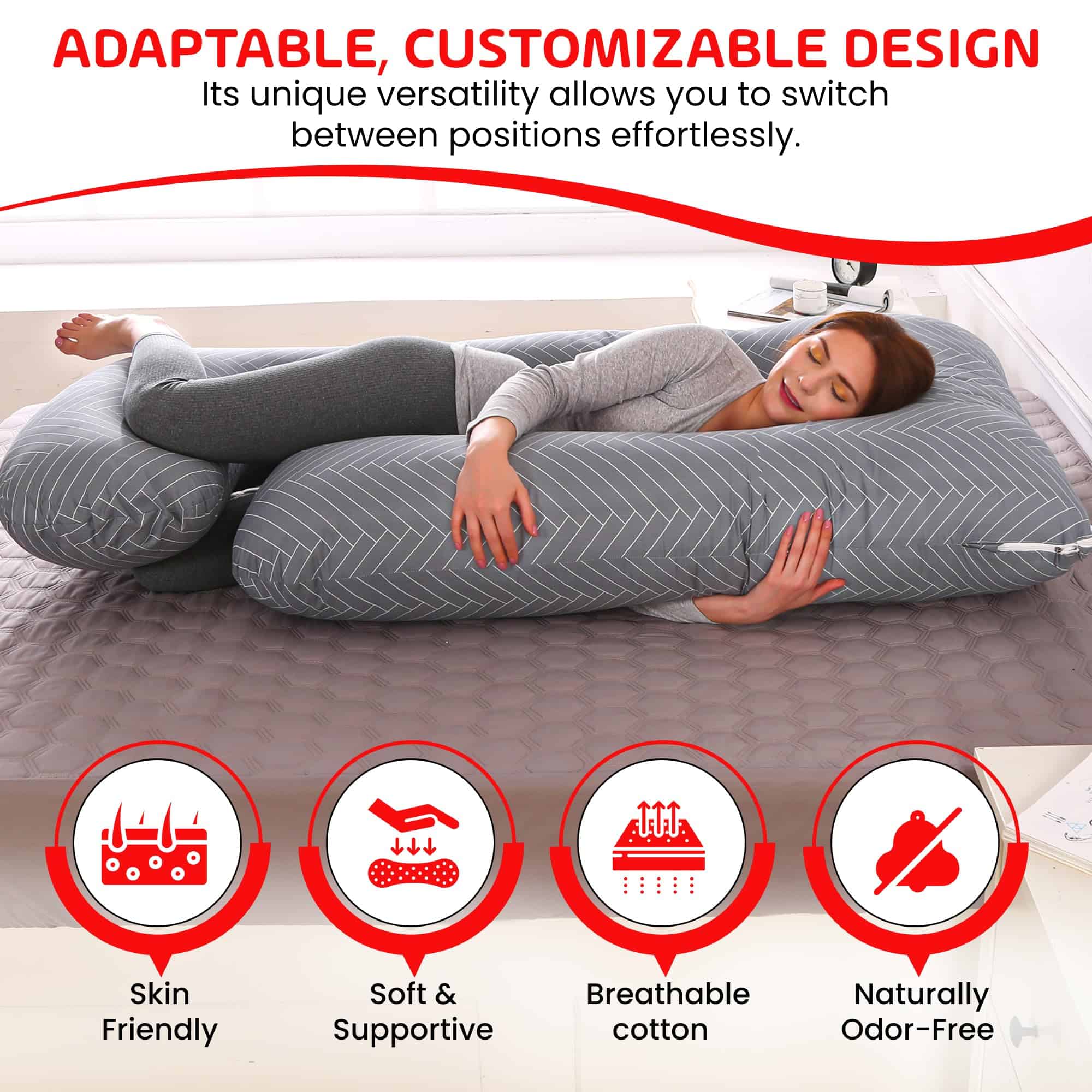 1. Diseño adaptable y personalizable: La versatilidad única te permite cambiar de posiciones, brindando un apoyo a medida para tu espalda, barriga, caderas y piernas. Es como tener múltiples almohadas en una, siempre ajustándose a tu cuerpo en constante cambio a lo largo del viaje.
